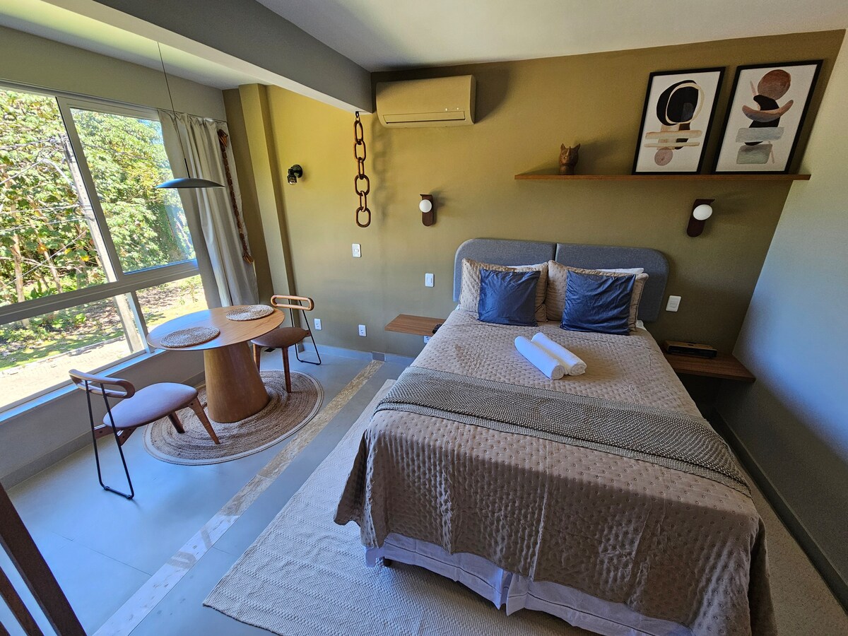 Welcome to your special getaway! Our charming new kitnet combines unique style with impeccable comfort and beauty. The exterior has two coconut trees that give the island its typical charm. Located in a quiet and reserved corner, it is less than 10 minutes from the center and the beach. Come be enchanted and live unforgettable moments