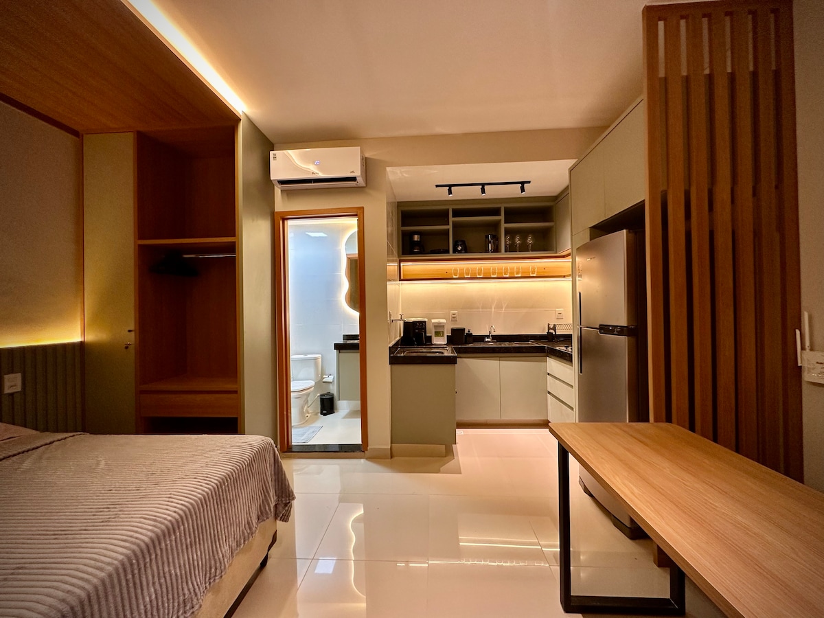 Hospede-se com estilo e conforto! Studio climatizado com marcenaria de alto padrão, iluminação LED aconchegante e cozinha completa com geladeira inox. Destaque para o banheiro moderno com espelho orgânico e bancada para trabalho. 🏢 No condomínio: Aproveite a área de lazer com sinuca e ping-pong, além da praticidade da lavanderia compartilhada. A escolha perfeita para sua estadia com sofisticação!