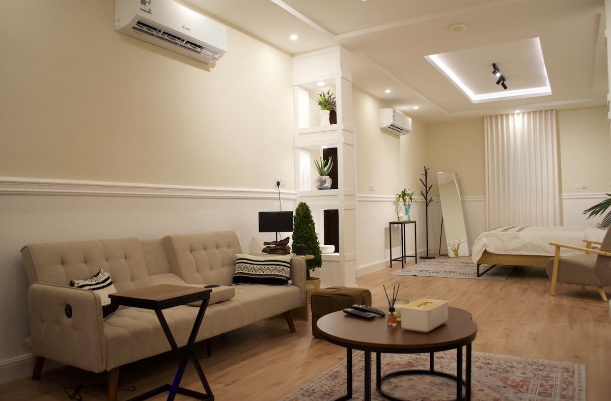 Welcome to our cozy private studio, designed for your comfort. 🚪Enjoy the convenience of Self Check-in with a smart keypad. Enjoy 5G wifi and a 75-inch TV with Netflix, Shahid, and YouTube Premium The bathroom is stocked with essentials like towels, soap, shampoo, and body wash for your convenience. Just a minute away, you'll find everything you need such as a mini-market, laundry service, barber shop, and restaurant.