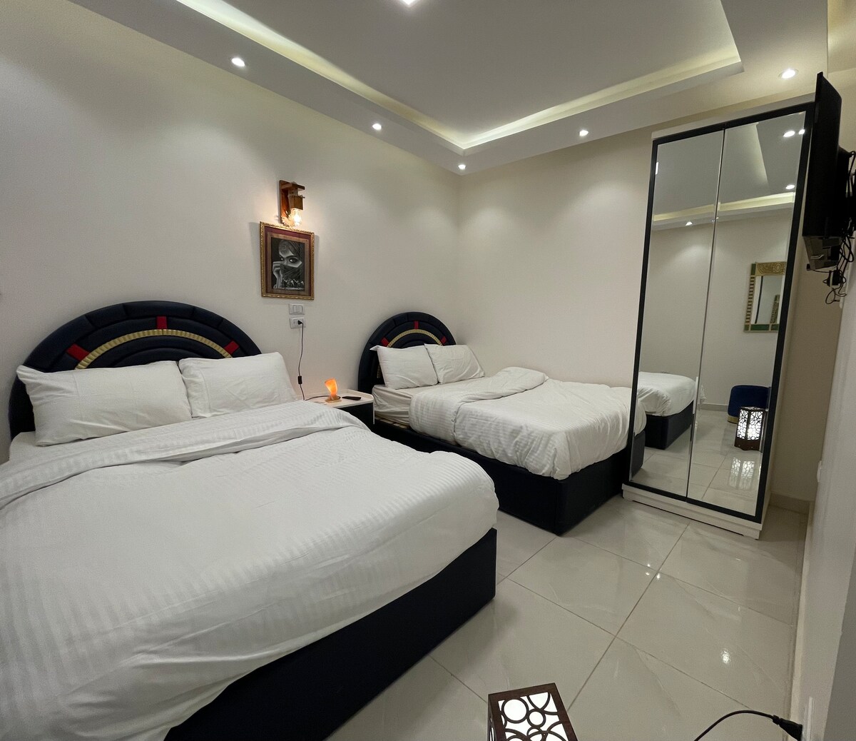Enjoy a wonderful breakfast with our stunning view of the three pyramids and sphinx. The room is located on our 3rd floor and is one of newly refurbished rooms. Guests will enjoy staying in beautifully designed, Egyptian themed room with a 2 Double bed and Pyramids View! There is a coffee/tea station with complimentary water. This is a family ran business, and when you are here, you are family. Anything you need, let us know. Every room has its private bathroom