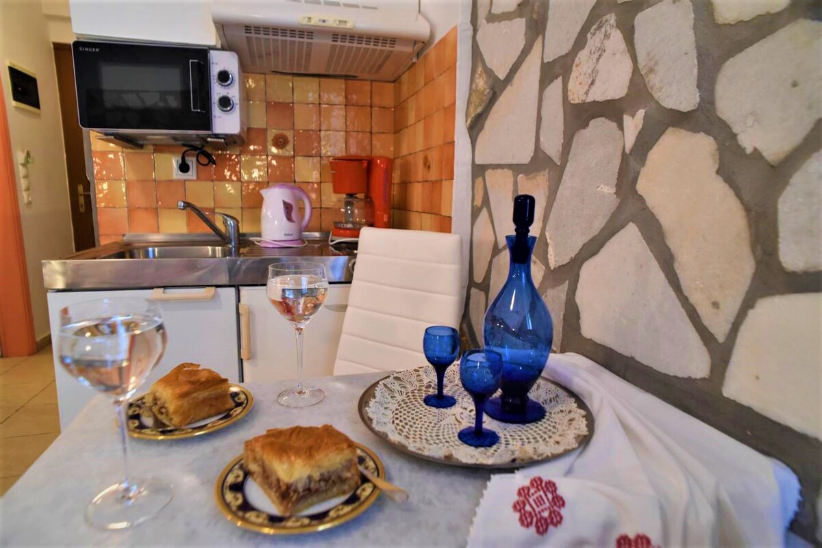 Do you want to live unique holidays in Naxos? Pasas Castle is the only way! Pasas Castle is located in a quiet area of the Naxos Center and is 2 minutes away from the Great Plaza of St. George. House of Poseidon (semi-basement appartment) has big double handmade iron bed, wooden wardrobes and bedside tables, scattered special mirrors on the marble walls, smart tv, modern water showers, kitchen with marble tables and royal tableware, beautiful yard and genuine large mirror.