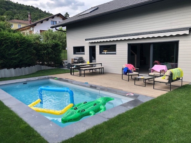 Old laundry workshop renovated by an architect with eco-friendly and natural materials Ideal place to rest after visiting LYON No parties, no evenings, no family or friend gatherings 10 x 5 m private swimming pool with compliant safety shutter Pool opening depending on the weather Play area Equipped kitchenette type kitchen and beautiful outdoor space for your meals Private independent parking