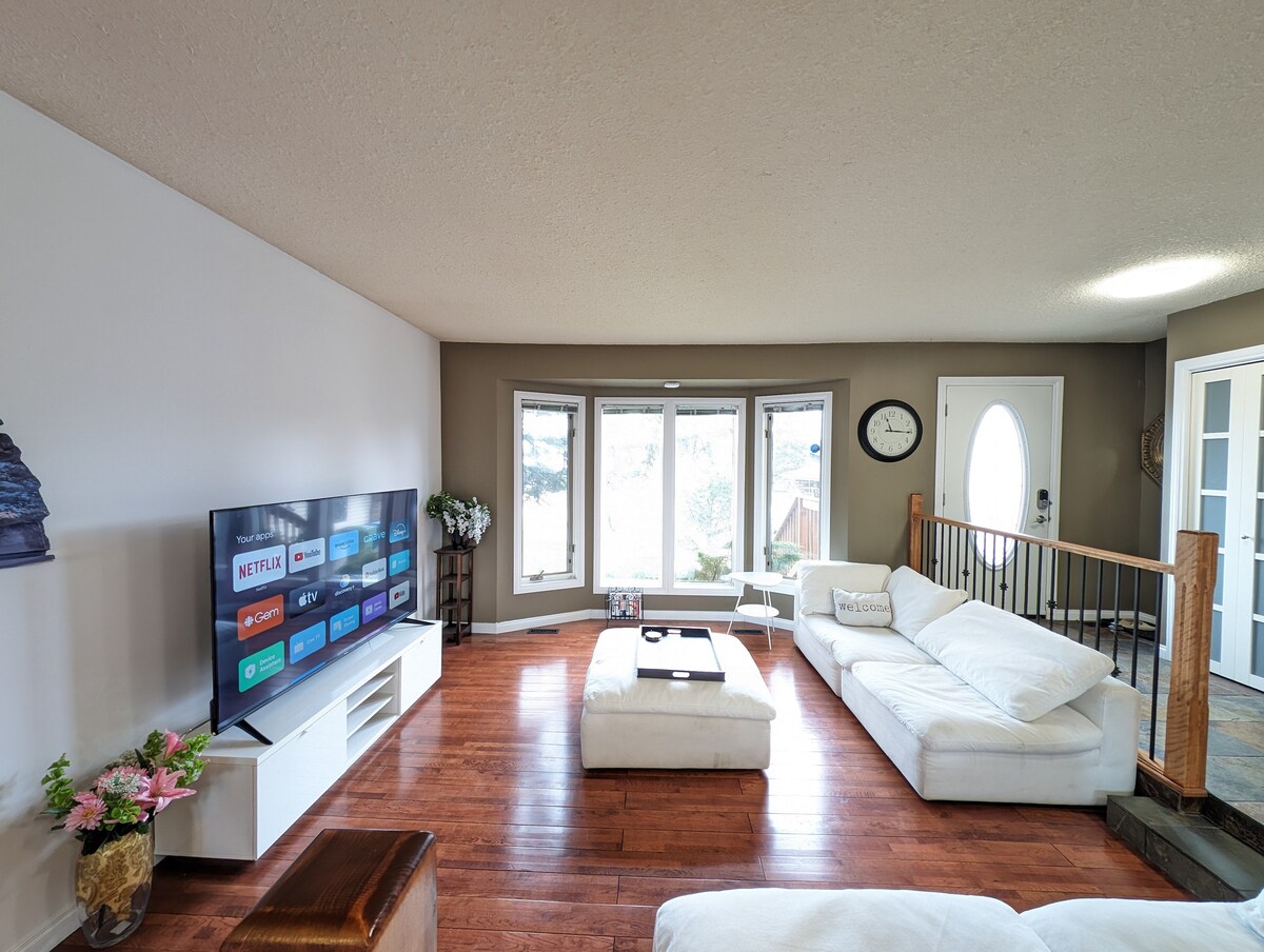 Kick back and relax in this quiet and stylish newly renovated clean bright home . This unit is not a basement suite like other comparably priced listings . Very close to shopping with easy access to down town. Highway 2 just 3 minutes away . Reserved off street parking . Smart TVs all wifi ready along with your personal kurig for hot drinks . Each bedroom has its own cordless phone charging station. 14 minutes to Calgary international Airport