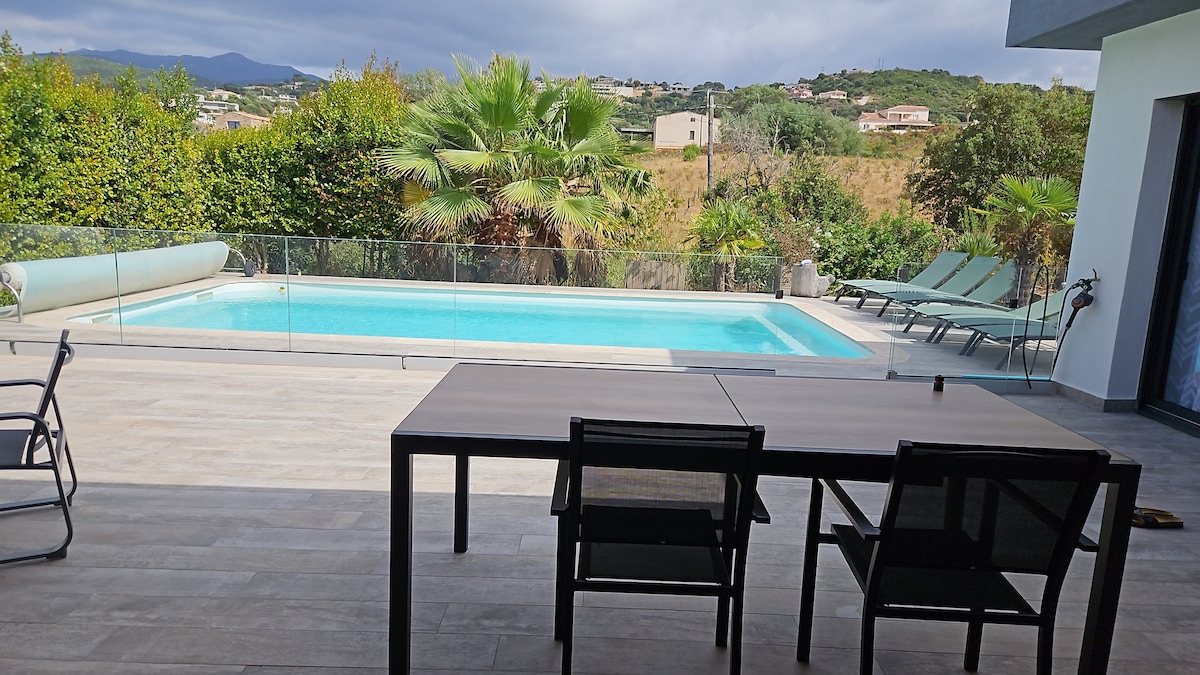 Modern 120 m² single-storey villa, ideal for holidays with family or friends in a peaceful and quiet setting. The villa is composed of 3 bedrooms with bathroom/water, a kitchen/living room overlooking a terrace with pool, fire pit and garden furniture. From the terrace you will have a view of the surrounding vineyards and mountains. Sheets and towels provided Ideally located 3 minutes from the city center, beaches and the pier to take the shuttle to Ajaccio.