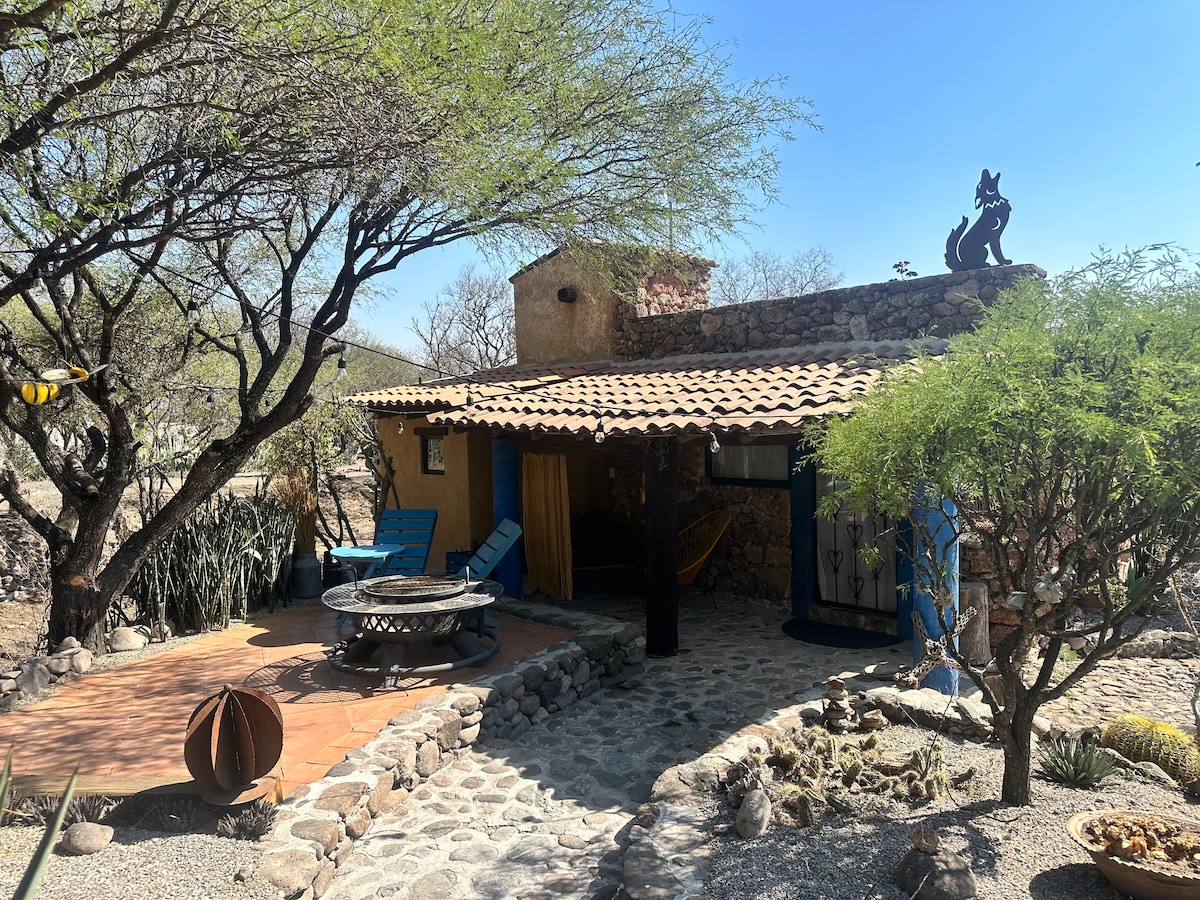 Mexican-style house, ideal for families and couples (NOT GROUPS OF YOUNG PEOPLE) located in the back of the town of Bernal, a charming place to rest and enjoy tranquility in the middle of countryside landscapes, it has a living room with a half bathroom, 2 bedrooms both with full bathroom, equipped kitchen with a large dining room, refrigerator and fully equipped with utensils Terraces overlooking the rock, equipped with garden furniture and a fireplace for moonlit nights
