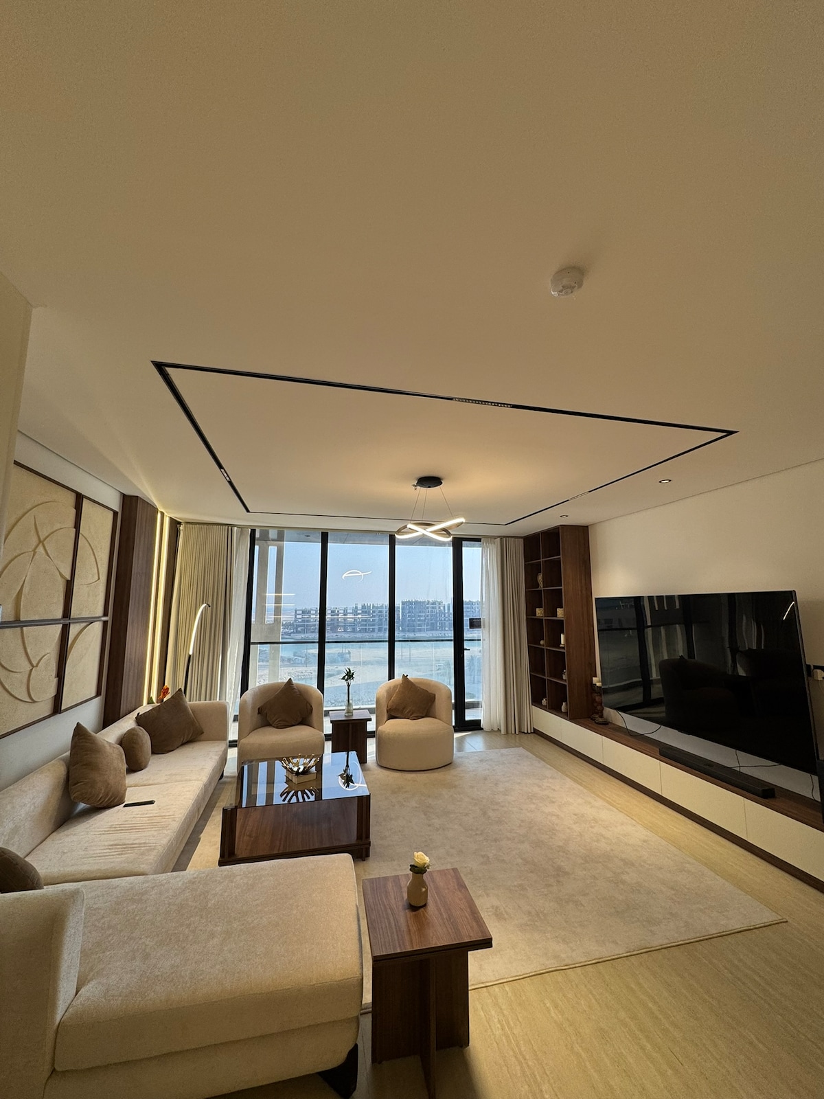 A studio that combines all services under one roof, featuring large windows on both sides and fully smart features, including smart curtains, smart entry, smart screen, smart lighting switches, and all services in the apartment are voice-activated with Alexa service. - High-end furniture with our modern and exclusive design T Home - Comfortable mattress with hotel felt from the American company Stive - Comfortable sofa and relaxation chair from Pan Home - 75-inch smart screen - iPad tablet for voice command control Alexa - Microwave - Refrigerator - Iron with ironing board - Coffee Corner - Single-use towels - Isthwar - Shower gel and shampoo