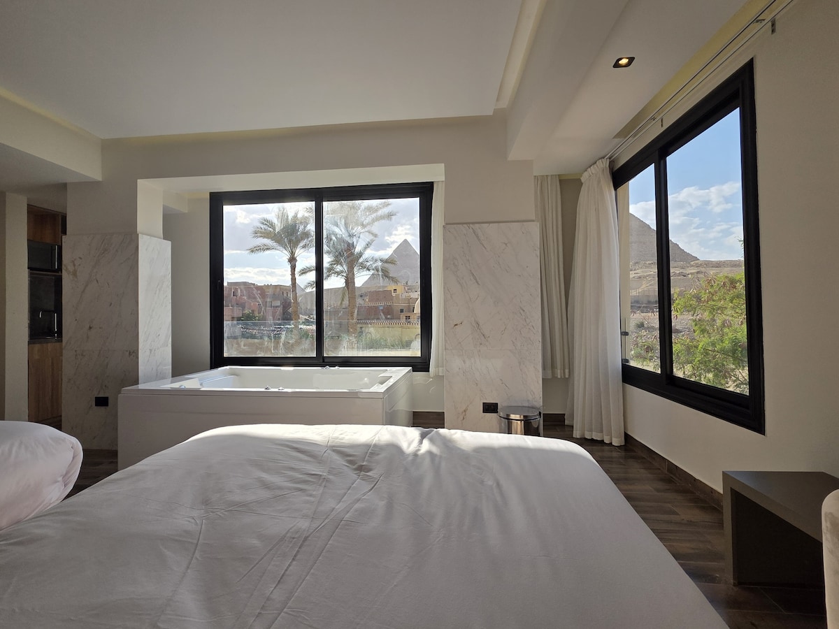 Enjoy a wonderful travel experience in this residence. Experience a blend of luxury and history in our elegant studio, located steps from the famous Pyramids of Giza, the Great Sphinx, and the Grand Egyptian Museum. Whether you're a history buff or looking for a picturesque retreat, this wonderful space offers the perfect stay for unforgettable moments. The elegant interior features luxurious furnishings, rich fabrics, and modern amenities. Relax in an atmosphere of peace and tranquility.