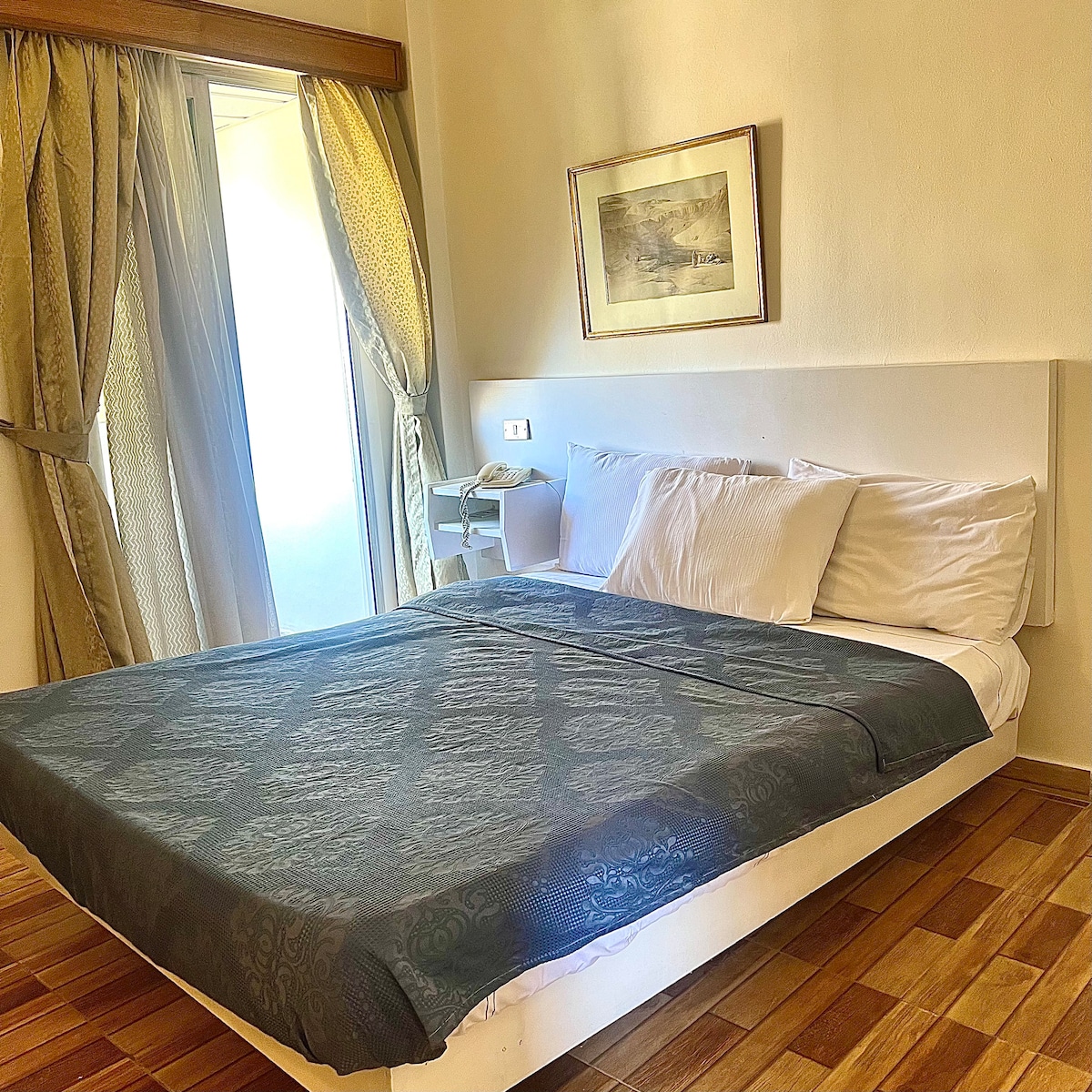 Cozy hotel room with King Size Bed and ensuite bathroom, located directly on the tram line in downtown Alexandria. Steps away from Alexandria University, the Library of Alexandria, and the Greek Roman Museum. Enjoy complimentary open buffet breakfast, free on-site parking, and professional cleaning during your stay. Bar and bakery available for an extra fee. Ideal for travelers seeking convenience, comfort, and proximity to Alexandria's key attractions. 24-hour reception and dedicated host.