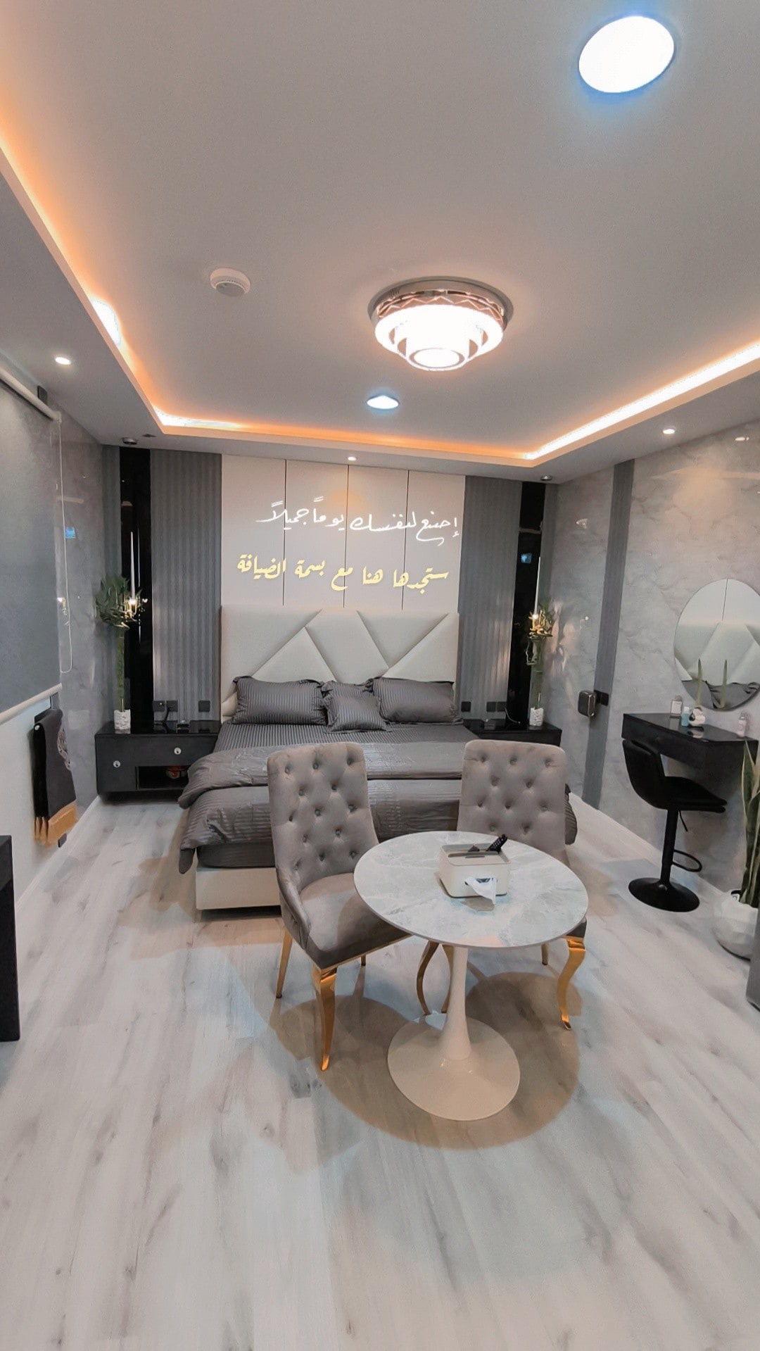 A studio with elegant furniture and self check-in