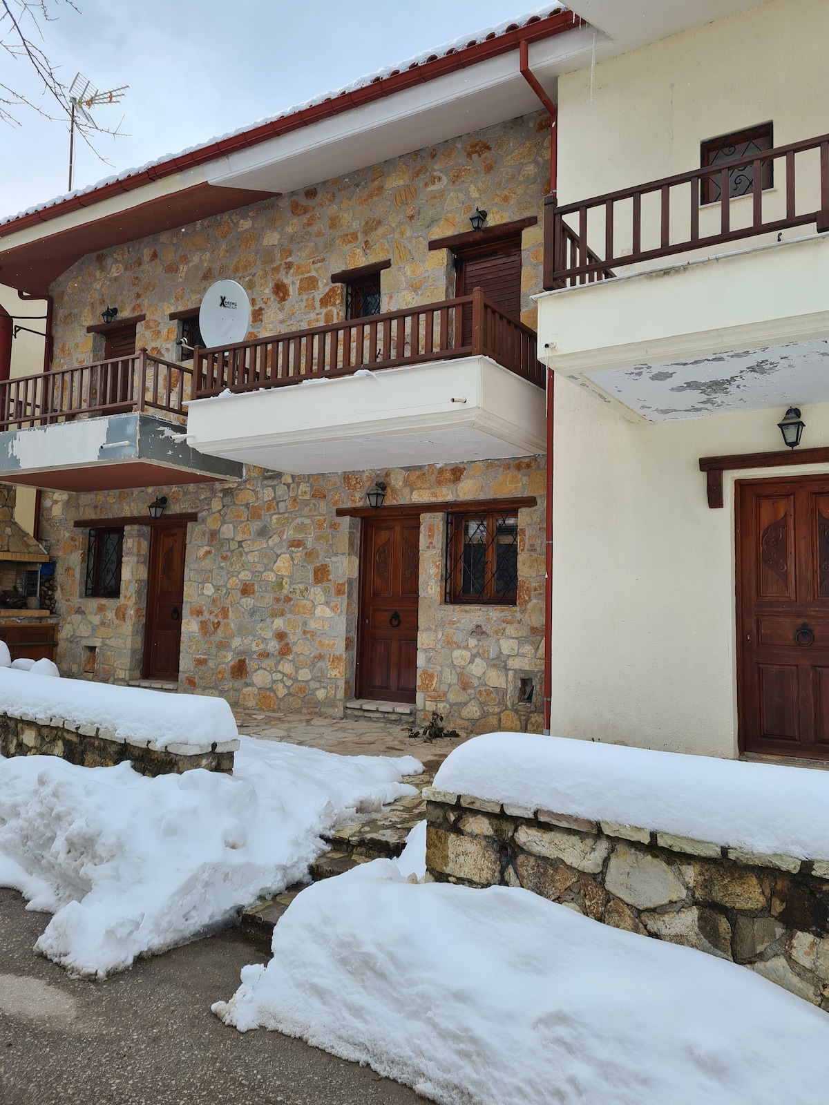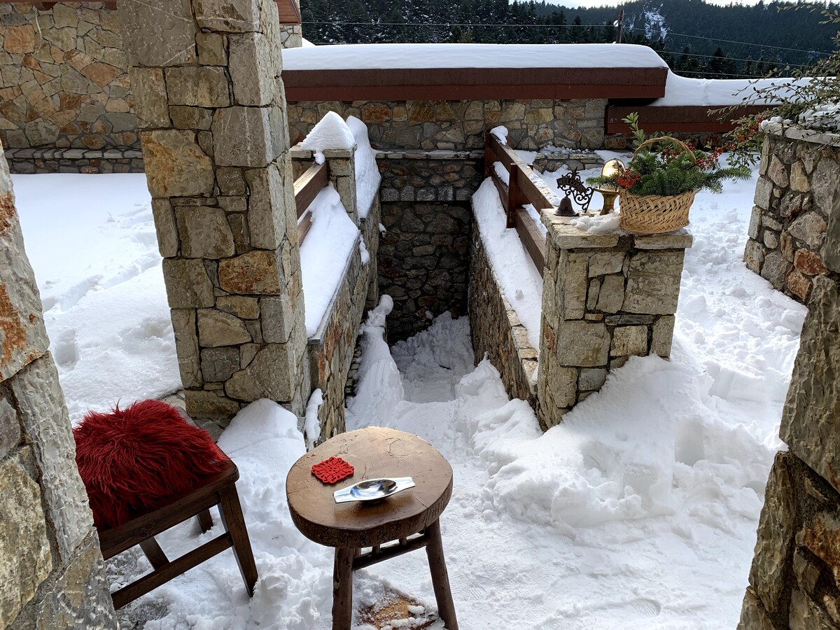Enjoy your stay in this cosy studio apartment with a luxurious double bed in front of the fireplace. Ideally located in a quiet neighbourhood at the centre of Arachova, only 100m away from the shops and restaurants. Fully equipped to make your stay worth and comfortable. The stone front-yard is ideal to have your morning coffee under the cedar tree, before you set off to experience Arachova and Mt Parnassos.