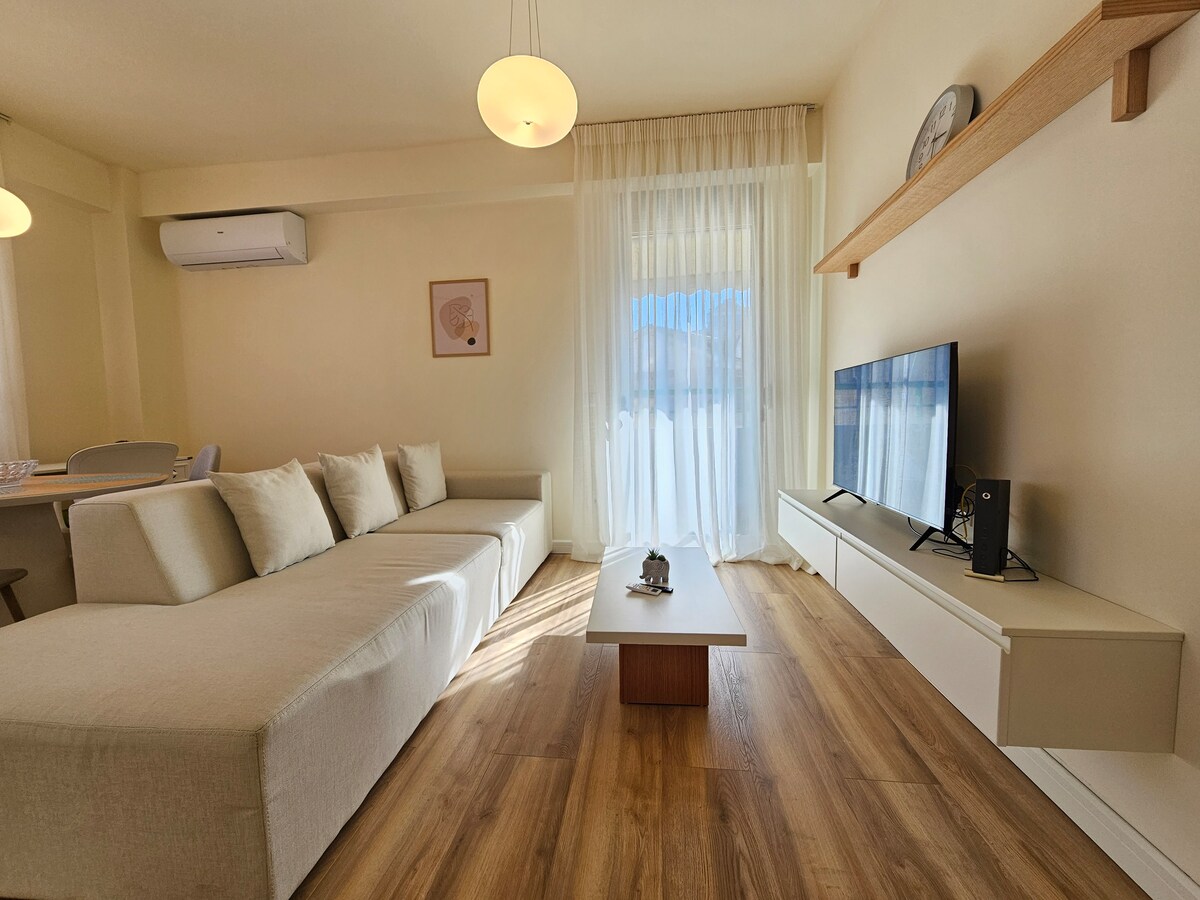 Recently constructed apartment that combines a panoramic view of the sea and its stunning sunsets, with a cozy atmosphere.Entering the apartment you will encounter a spacious living room with a large sofa that can be transformed into a queen sized bed (for 2 people).You will also find a fully equipped kitchen.The roomy bedroom includes a king sized bed and a closet. Furthermore, there is a modern bathroom.*both the kitchen and bedroom have access to separate balconies and contain TV sets and AC.