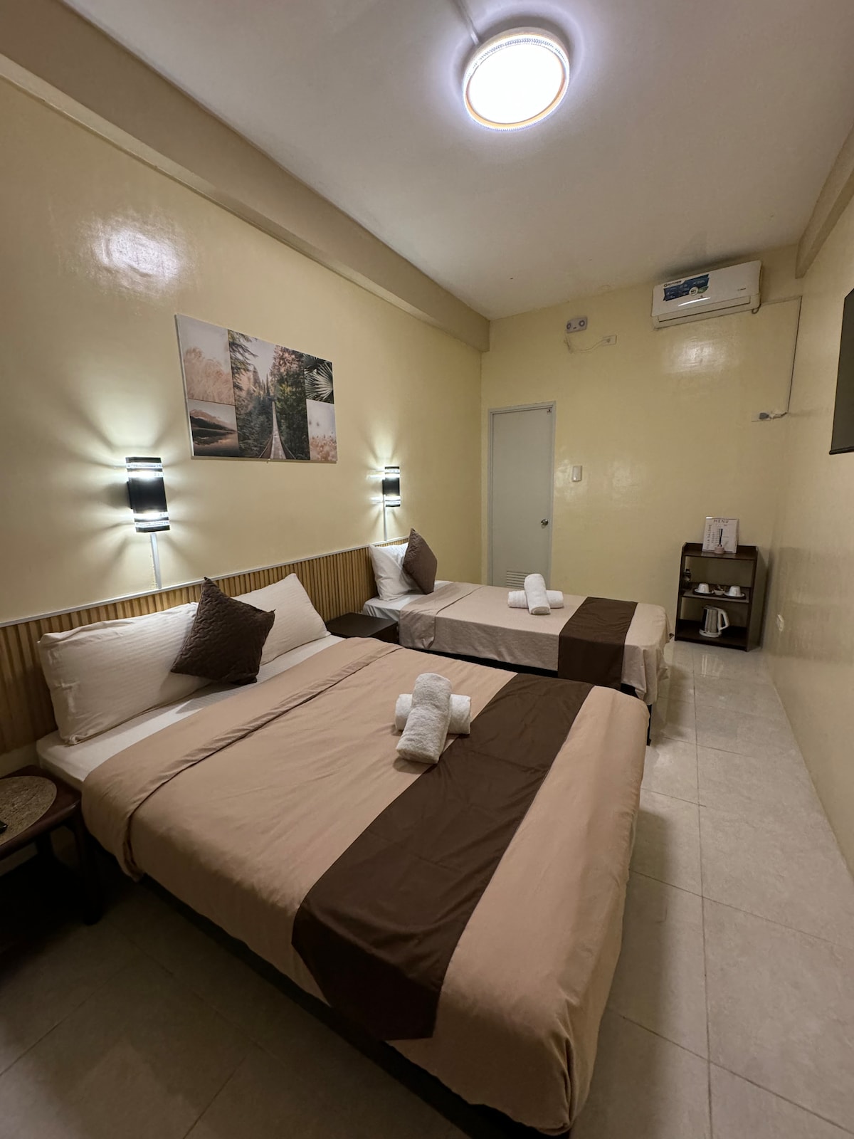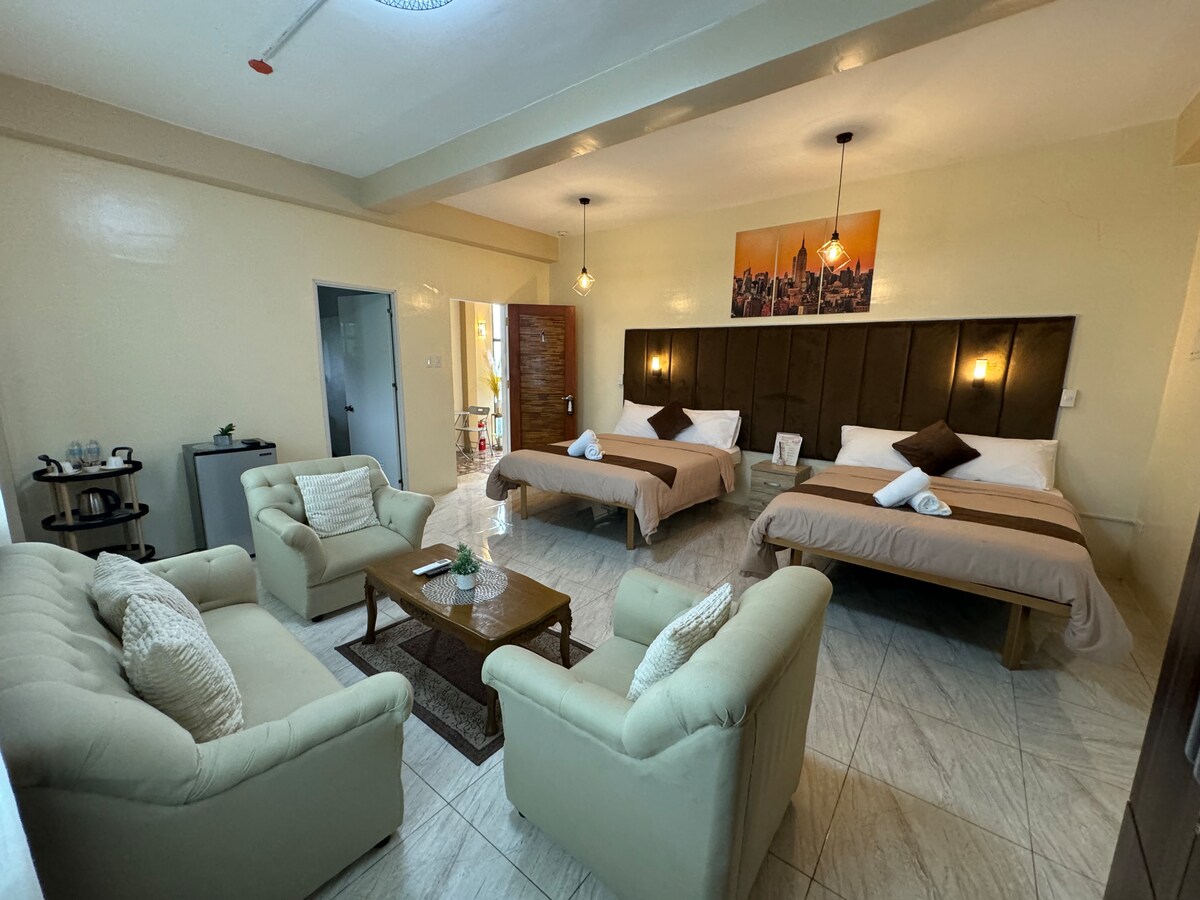 Renovated and removed the partition so now only 1 bedroom with 2 queen beds. 1 CR...It is located on the 3rd floor with separate entrance from the main house. The main house has a generator including room for guests, hot and cold water or shower, best for family or friends. Room can accommodate 4 persons ...Airconditioned.... no charge for children... we no longer serve breakfast ever since Covid 19 ... but we will provide you with stove, rice cooker and kettle