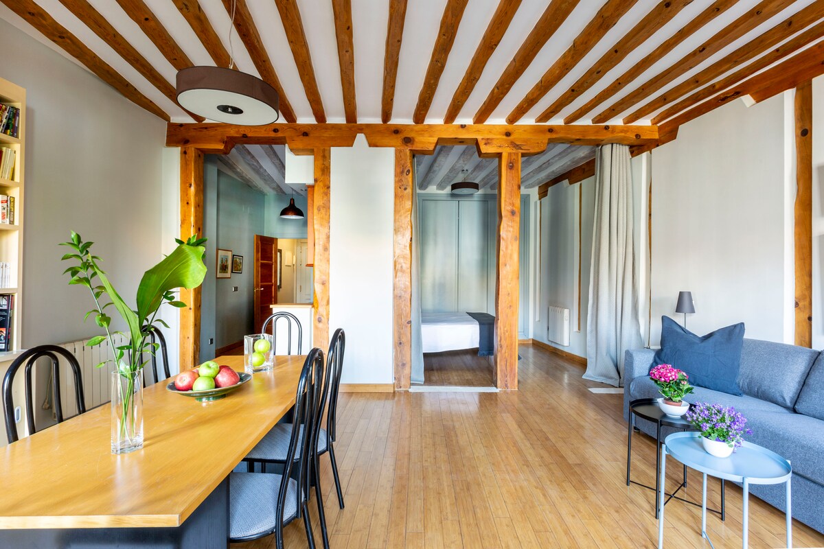 Open tall wooden shutters and let morning light stream into a room with exposed timber framing and whitewashed brick walls reaching to high ceilings. Have breakfast in a cheerful open space at a sunny table in front of an elegant fireplace. I have several apartments in Madrid, but this is the latest one I have decorated, paying close attention to detail. I have truly tried to make it as comfortable as possible for my guests. It has lots of light and it's beautiful. If one were to read my reviews they would notice that I care a lot for my guests, I am always readily available, and I try my best to make them feel at home when they are in Madrid. You will have the whole apartment. We will be there in person to meet you, and give you the keys. After you book, I give you my number and you can text or call if needed. The apartment is in Chueca, one of the nicest and trendiest neighborhoods in Madrid. Walk to the main street, Gran Via. It's near the Prado, Puerta del Sol and Parque del Retiro. It's surrounded by wonderful places to have tapas and a glass of wine. We are about a block away from the Gran Via, you can walk everywhere, but we also have metro stations and buss stops nearby. If you are coming with a car, there is a Public Parking Garage about 2 minutes walking from the apartment.