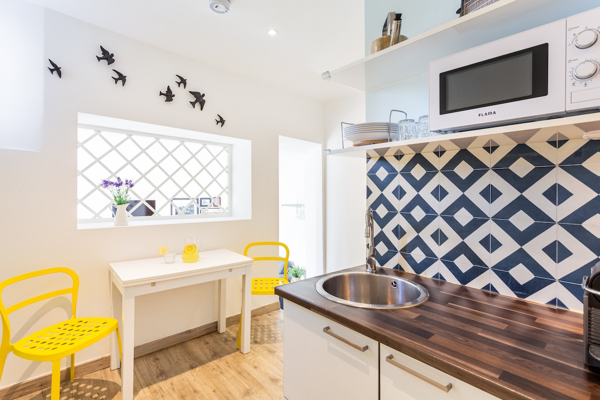 This renovated studio is located in Areeiro, one of the most central location in Lisbon, walking distance from two metro station and 10 mints from Downtown area by metro. It has a leaving room and dining area, a functional kitchenette, one double bed in the mezzanine accessible by stairs, and one bathroom with shower. The apartment has natural sunlight with a small balcony and a large window. It's located at the 3rd floor, and although with no elevator, the stairs are large and easy access.