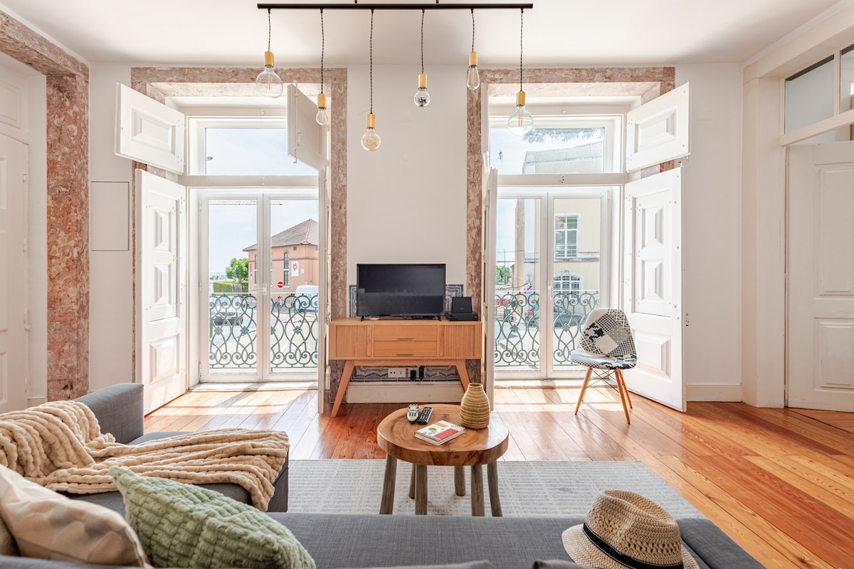 Apartment in the heart of Lisbon. This one-bedroom apartment with a sofa bed features a double bed, a bathroom, and a fully equipped kitchen with a refrigerator and a washer/dryer. The living room opens onto balconies with a table and two chairs for outdoor use. Located just a few steps from historic cafés, traditional shops, iconic trams, and the Tagus River, it is the ideal starting point to explore Lisbon.