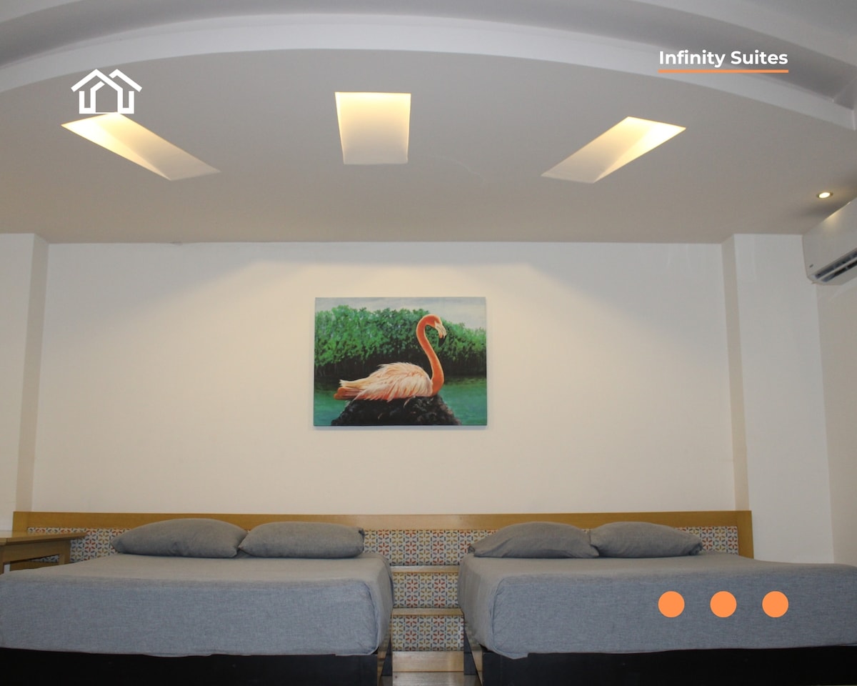 ¡Encantador Suite Familiar en Aparthotel con piscina! Perfecta para familias o grupos que viajen juntos pero busquen habitaciones separadas. Contarán con 2 habitaciones privadas y 1 baño completo privado. -Cada habitación cuenta con: -A/C -SMART TV con cable -Closet y frigobar Además podrán disfrutar la piscina de este bello aparthotel, así como su cocina. --Ubicado en privada residencial con seguridad -gran ubicación cercano a supermercado, parada de bus y restaurantes.