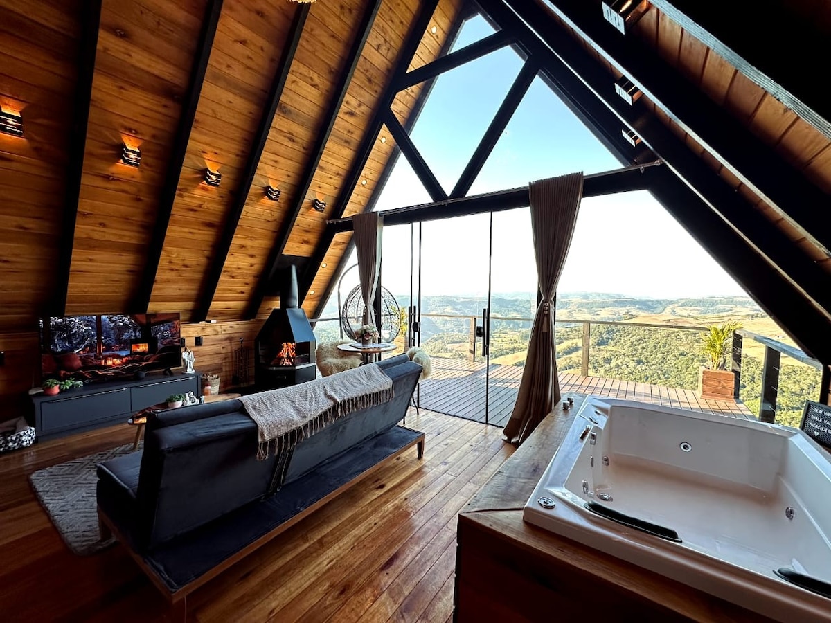 Perfect location for those looking for a cozy atmosphere, a breathtaking view and enjoy a place with a lot of peace and fresh air. The accommodation has an incredible whirlpool with chromotherapy, for you to relax and have unique and unforgettable moments. It has a fireplace and floor fire for you to warm up on colder days. The place has an infinity swing for you to take amazing photos 😍 And to top it off, there is THAT delicious breakfast already included in the daily rate 🤤😋