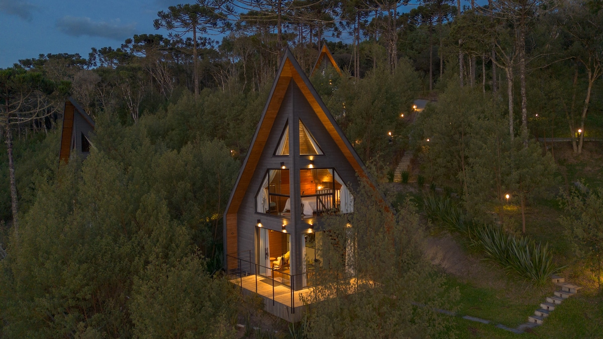 Escape the world for two in our romantic cabin in the Serra. A private retreat with a double fireplace, fully equipped kitchen and hot tub. Fully automated by Alexa, it also offers Smart TV, Wi-Fi, air conditioning and premium linens. Amidst the silence and nature, experience unforgettable moments with comfort and practicality.