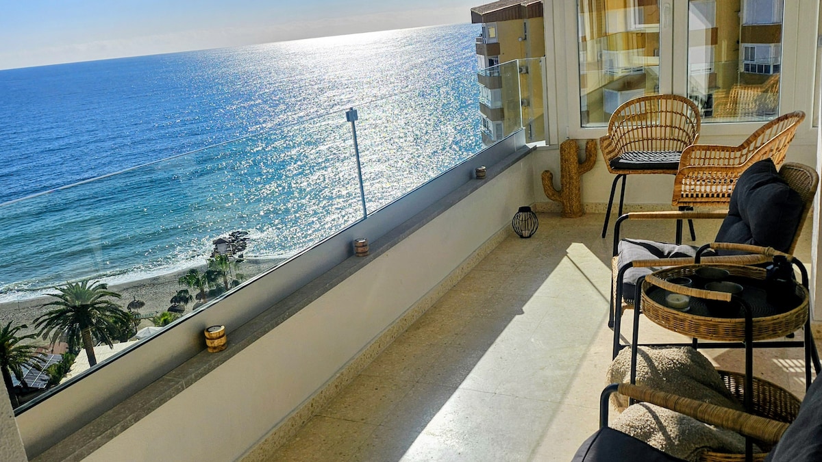 Brand new apartment with spectacular ocean and mountain views, fully renovated and equipped for four people. Located on the promenade, with access to a swimming pool, tennis courts, gardens, and playgrounds. Very quiet area, close to restaurants, supermarkets, golf course, marina, taxi rank, etc. Free 300mb WiFi, Air Conditioning, 58” TV with Smart TV and Channels in several languages via Satellite. 7th floor with elevator.