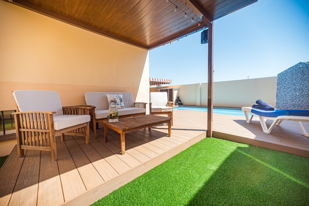 Escape to our stunning villa, perfect for family holidays or remote work. This spacious retreat accommodates up to 11 people and features a beautifully landscaped garden, a fenced heated pool, and a chill-out area. The main house includes 4 bedrooms and 3 bathrooms, while a separate 1-bedroom garden apartment offers additional privacy. Enjoy a large BBQ, outside bar, table tennis, darts, and a basketball net. Located just 20 minutes from the beach, with fast internet for seamless work sessions.
