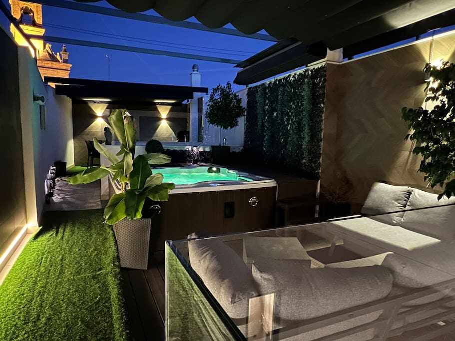 Exclusive 3-bedroom duplex in the heart of Seville, each room with a private bathroom and TV. The master bedroom includes a private terrace for peaceful moments. The crown jewel is the outdoor terrace with a private jacuzzi and dining area, perfect for enjoying the Sevillian sky