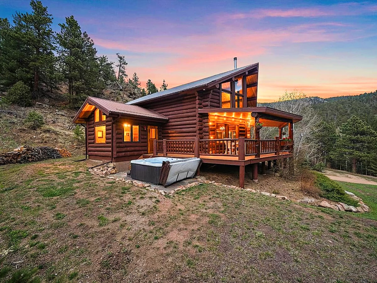 Nestled in the outskirts of Lyons, Colorado, just 11 miles from Rocky Mountain National Park (6 miles southeast of Allenspark), the Riverside Cabin combines the charm of a classic rustic log cabin with modern mid-century upgrades. You can admire the picturesque Colorado sunsets from the swing on the wrap-around deck, the hot tub, or through the floor-to-ceiling windows in the living room, which offer stunning views of the Saint Vrain Creek and wooded mountainside.