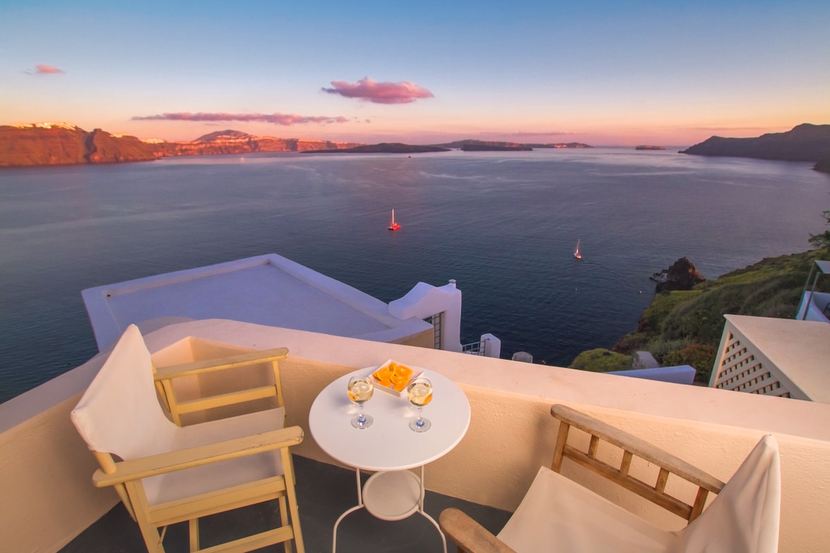 This is a studio for 2 guests It has a small kitchen and sitting area. There is a private balcony viewing the caldera. Situated in a quiet spot a few minutes walk from the main pathway and part of the Pano Meria group of studios and cave houses.