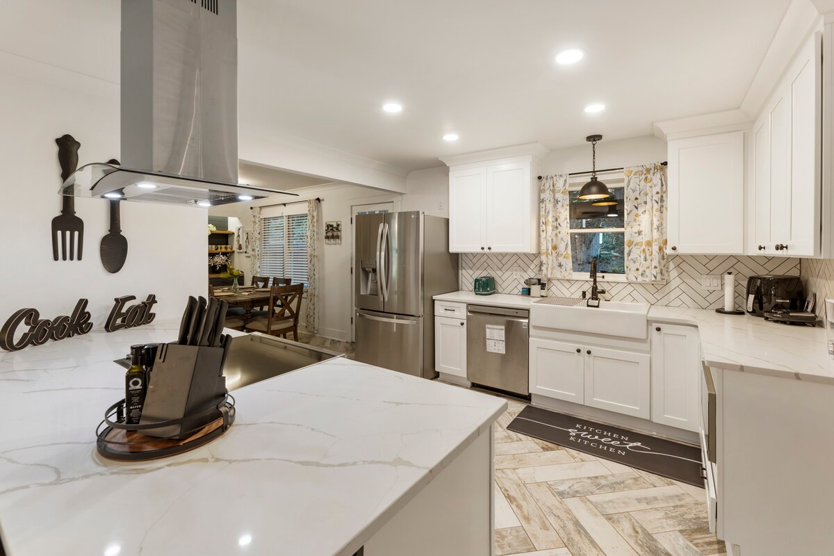 WALKING DISTANCE TO DOWNTOWN ALPHARETTA This NEWLY renovated home is the perfect choice for those seeking a comfortable & convenient stay. You'll have easy access to the city's best dining, shopping and entertainment within walking distance. Our home features: - Fully Equipped Kitchen: New Samsung appliances & Nespresso - Comfortable Bedrooms: King & Queen beds w/lifts - Outdoor Oasis: Large backyard w/grill & fire pit - Entertainment: Smart or Apple TVs in every room. Cornhole & board games