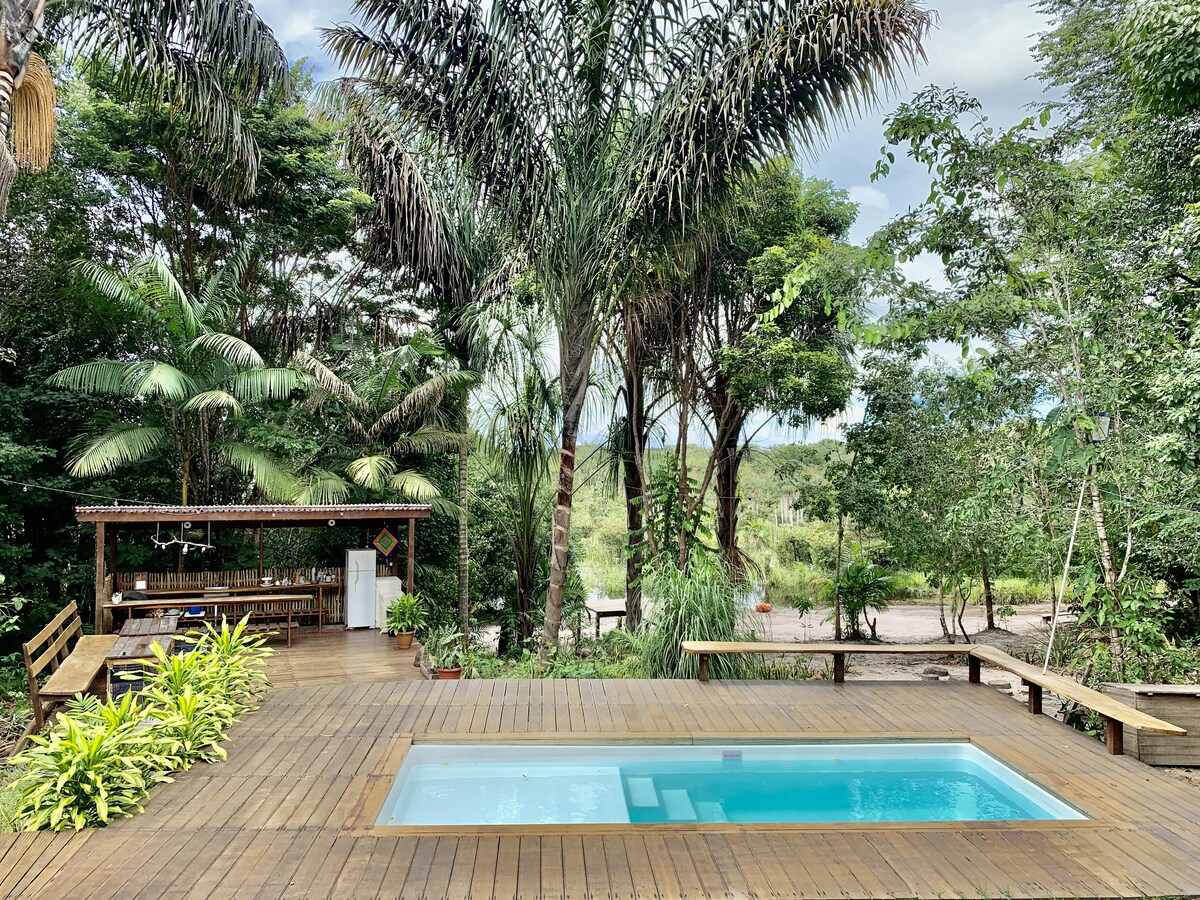 Nossa casa está localizada no bairro Jacundá 2, em Alter-do-chão, às margens do Lago do Jacundá e ao lado da praia Jacundá 2. Um santuário de tranquilidade, com uma piscina natural privativa de águas serenas para momentos de paz e contemplação. Ao abrir as portas, oferecemos não apenas um lugar para ficar, mas uma experiência completa de conexão com a natureza e relaxamento. Um lugar confortável, mas que não deixa de te fazer sentir realmente na Amazônia.