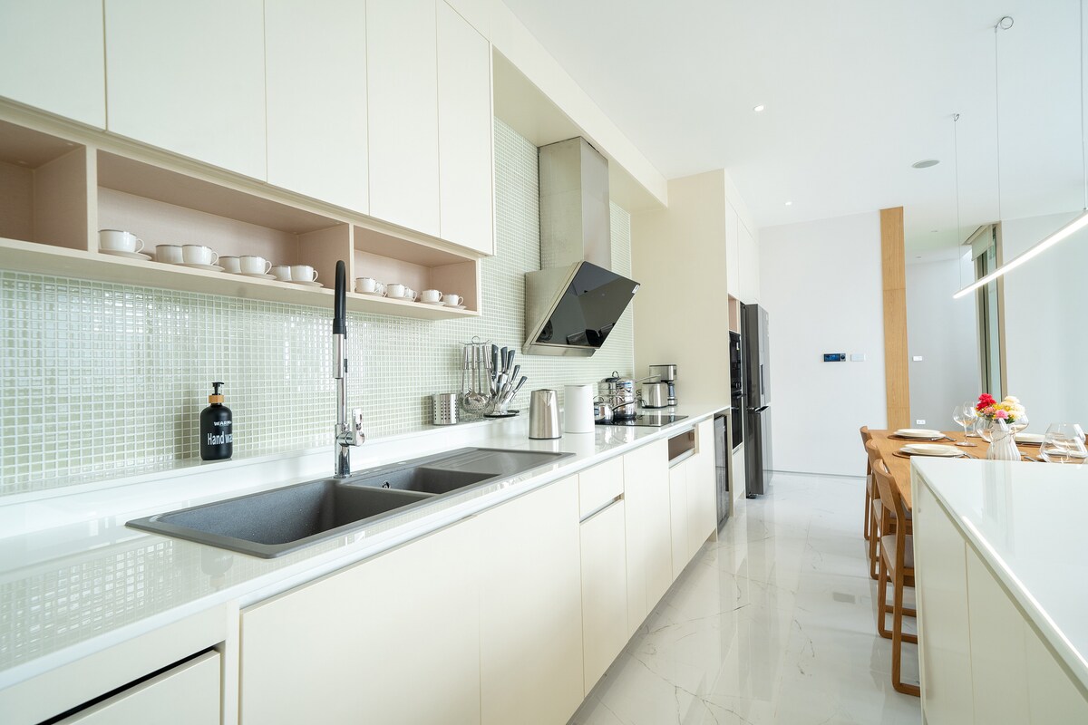 This brand new Y2 villa in Phuket is a 500 sqm garden view villa with a huge swimming pool, 4 bedrooms and 5 bathrooms. I'm sure you'll love it at first sight. Upon entering the villa, you'll find that the decoration and design are simple and modern, newly renovated, very clean, refreshing and comfortable. Each room has its own toilet and bathroom, providing comfort and privacy. The spacious kitchen is fully equipped to meet your cooking and dining needs. Outside the villa, the huge swimming pool is beautiful and elegant, making you feel like you are in an exotic setting, and feel more comfortable. Step into the courtyard, the bright and elegant atmosphere comes face to face, there is the fragrance of the soil, the lushness of the grass, and the leisure of the beach chairs. Everything is naturally elegant and subtly beautiful, adding a lot of poetry and painting to this villa. And when night falls, under the lights of the swimming pool, the entire villa is extraordinarily charming. Dine at the outdoor tables and chairs, with the music playing, have a drink with friends, it's wonderful! Here, you can enjoy a quiet and private vacation, get rid of the hustle and bustle of the city, and fully enjoy the beauty and blessings of nature. This is the endless happiness that staying at Y2 Villa in Phuket brings you! Relax and enjoy.