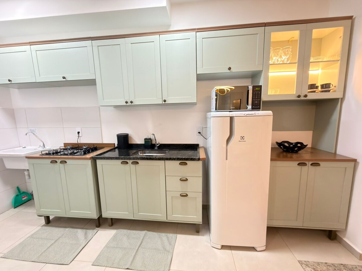 Studio aconchegante e funcional, perfeito pra quem está na estrada e quer uma parada rápida com conforto: dormir bem, tomar um banho caprichado e seguir viagem. • TV, ar-condicionado e sala com sofá • Cozinha equipada com micro-ondas, fogão e mesa para refeições • 1 banheiro • 2 camas de solteiro + sofá (acomoda até 3 pessoas) Aceita pets de pequeno porte. Comodidade extra: Ao lado do studio tem um mercadinho, onde você encontra pão francês e também alimentos e itens do dia a dia..