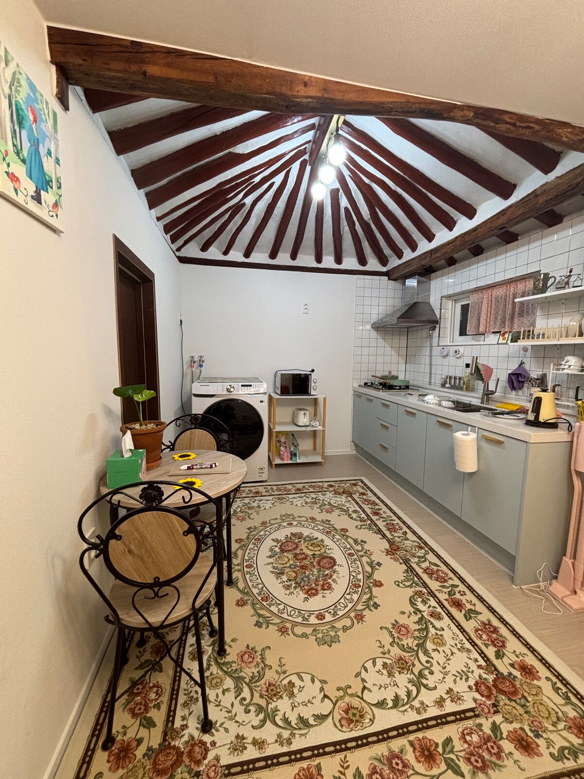 Hanok stay where you can enjoy the attic Turn on the attic of Ruga. This is a private accommodation where only one team can use the main building and a separate building of 26 pyeong in a 100 pyeong yard. Hanok Stay Ruga has enough space for couples and 4-5 family trips, with a comfortable private accommodation space like a hotel and a separate kitchen with a fairy-tale European feel. The spacious yard is composed of pretty flowers and landscape water and is suitable for children to play. It is a great place to read books, listen to music, relax quietly, drink tea, enjoy the scenery of the village, or enjoy a half-bath and relieve the fatigue of travel. In the evening, you can enjoy a barbecue even if it rains in the separate kitchen, and it is a sensational accommodation with both coziness and comfort to make wonderful memories by watching the stars in the night sky with the sound of grass bugs and making a fire in the yard. It is 3 minutes by car from Pungsan-eup, Andong-si, and 10 minutes from Byeongseonseowon Buyongdae, Hahoe Village, Gyeongsangbuk-do. Breakfast includes sandwiches, drinks, and rice noodles for free, and capsule coffee, coffee beans, and Osulloc tea are provided.