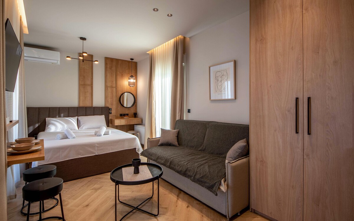 Fully renovated apartment with elegant aesthetics in one of the most central parts of the city, on the second floor with access from the stairs. Spacious, warm, modern, able to steal your heart. It consists of an open space that includes a living room-kitchen and a queen size bed with an anatomic foam mattress. The excellent quality sofa becomes a bed and the space is able to comfortably accommodate 4 people. In case of more people, the house has another bedroom.