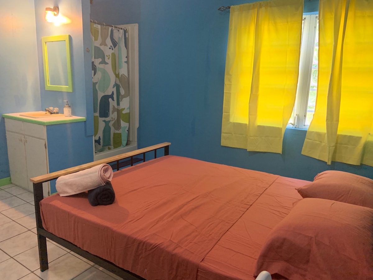 Located in the heart of it all with a ten minute walk to pristine Jolly Beach and a hop and skip to the socially active Jolly Harbour, our room features a quaint and cozy bedroom with Caribbean flare! This room has 3 full size beds and a coffee bar with a mini fridge and microwave. Located on the third floor. Must climb stairs (the views are worth the cardio!)