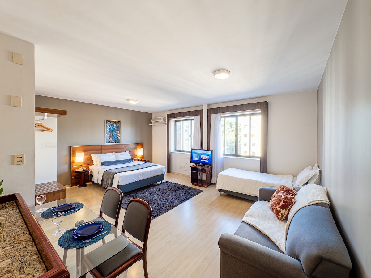 Apartamento localizado em um flat, com toda a infraestrutura de um hotel, café da manhã, limpeza, roupa de cama e banho, academia, Wi-Fi, estacionamento