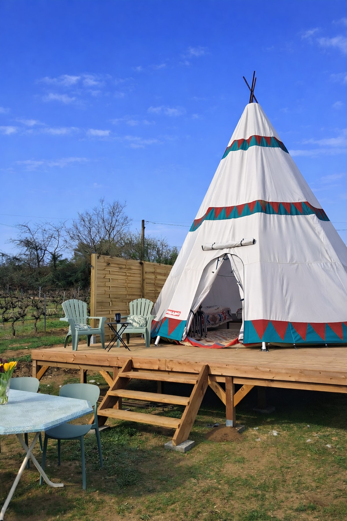 ⛺ Séjour insolite en Ardèche ! ✨ Vivez l’expérience unique d’un tipi confortable niché entre les vignes et la rivière Ardèche.