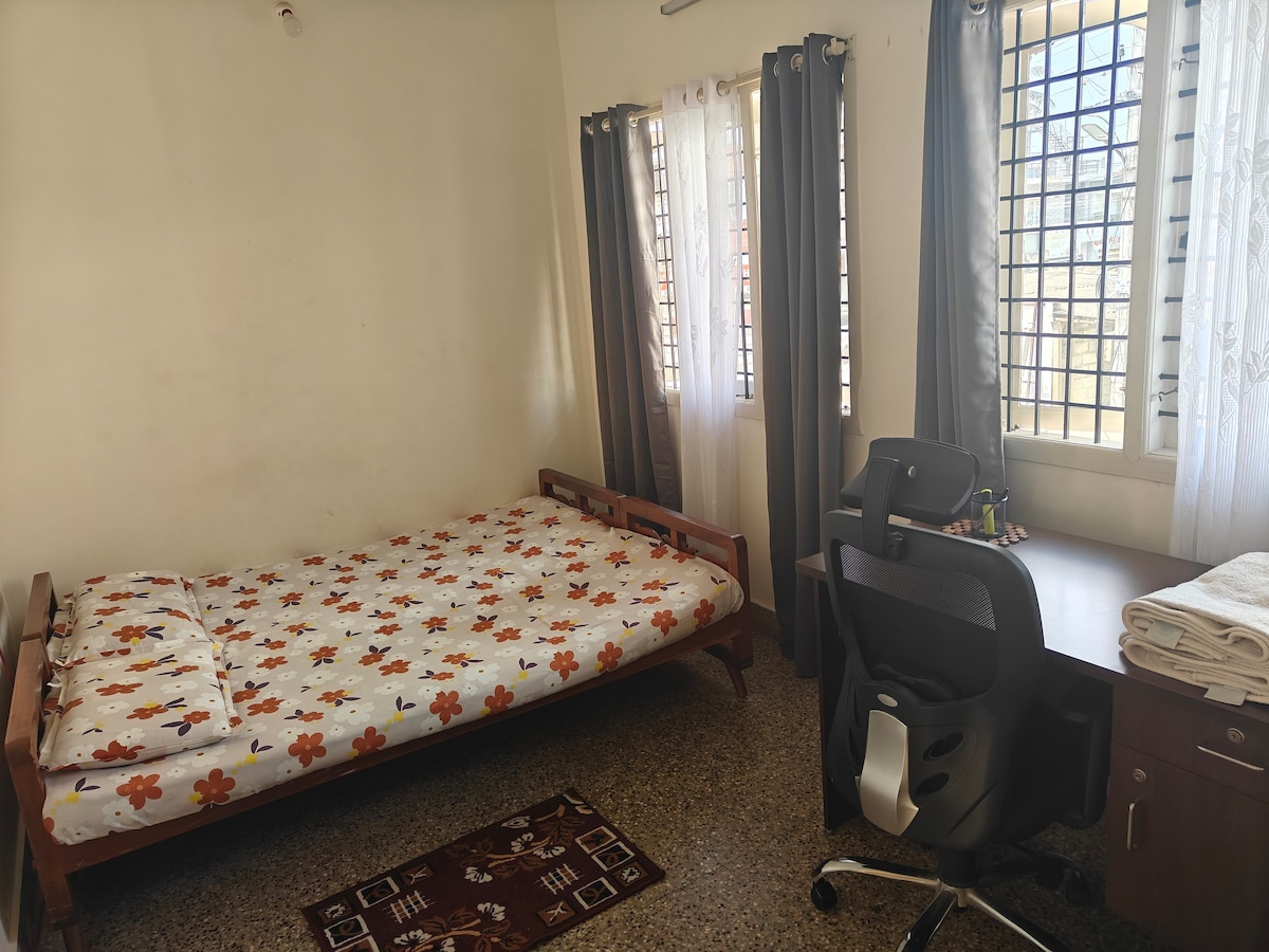 A cozy one-bedroom house in a quiet and laid-back neighborhood in Hassan. Spacious with essential amenities for someone who is traveling in and around Hassan. Very convenient place to stay for travelers visiting nearby places like Belur, Halebeedu, Sakleshpur, and en route to Chikmagalur. Clean space in a family-friendly neighborhood. Isolated and separate access to the first floor facing a lush green park. Ample outdoor space on the terrace to enjoy the evening breeze.