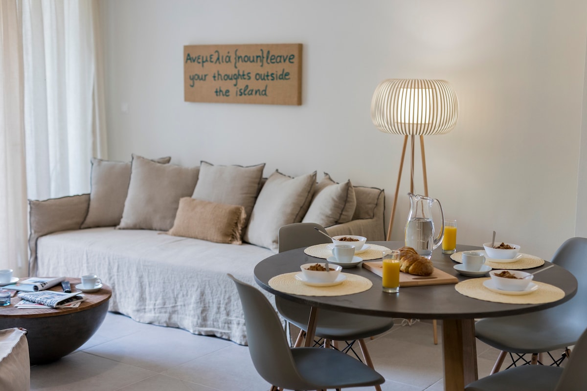 Argostoli is the heart and soul of Kefalonia. The largest town and capital of the island, it has most of the shopping and nightlife options, plus access to many of the most beautiful beaches all around it. This modern and very spacious studio apartment at the edge of town can be the perfect spot to host your Kefalonia vacation experience. On the ground floor of an apartment building, our fully renovated studio is an airy and bright open space, ideal for a couple.