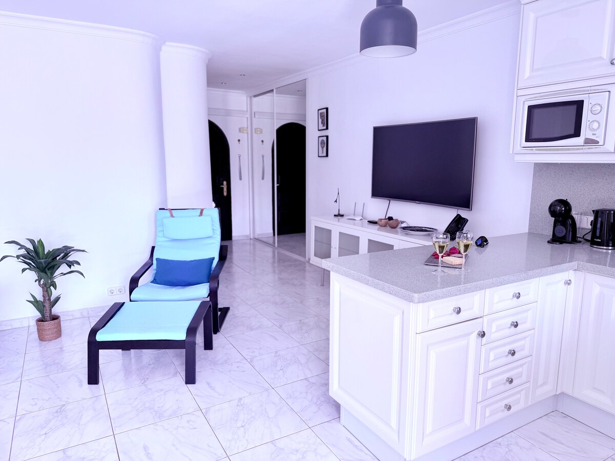 Enjoy a stay with all comforts in this central accommodation with WI-FI and sea view terrace, in the fishing port of Arguineguín, 100 m away. from the beaches of Costa Alegre and Las Marañuelas. The complex has elevators, parking and solarium with swimming pool, and mountains/beach/ocean/Teide views. Consists of a double bedroom with TV and ceiling fan, bathroom with shower, living room with AC, ceiling fan, smart TV and comfortable sofa bed. Great fully equipped kitchen.