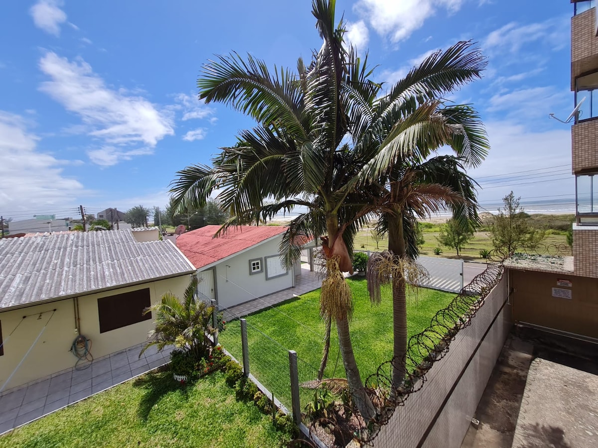 Penthouse apartment on the second floor, two bedrooms with split air-conditioning, balcony facing the sea. The view is incredible, sea and mountain views 360°, one apartment per floor, living room with integrated kitchen, TV + BTV10, microwave, all kitchen utensils and barbecue. Laundry with washing machine. The apartment's highlights are the balcony and the barbecue grill. If there are more than 5 guests, I have one more apartment downstairs. It is in the Figueirinha Neighborhood, 1.3 km from the center of Arroio do Sal and 80 meters from the sea