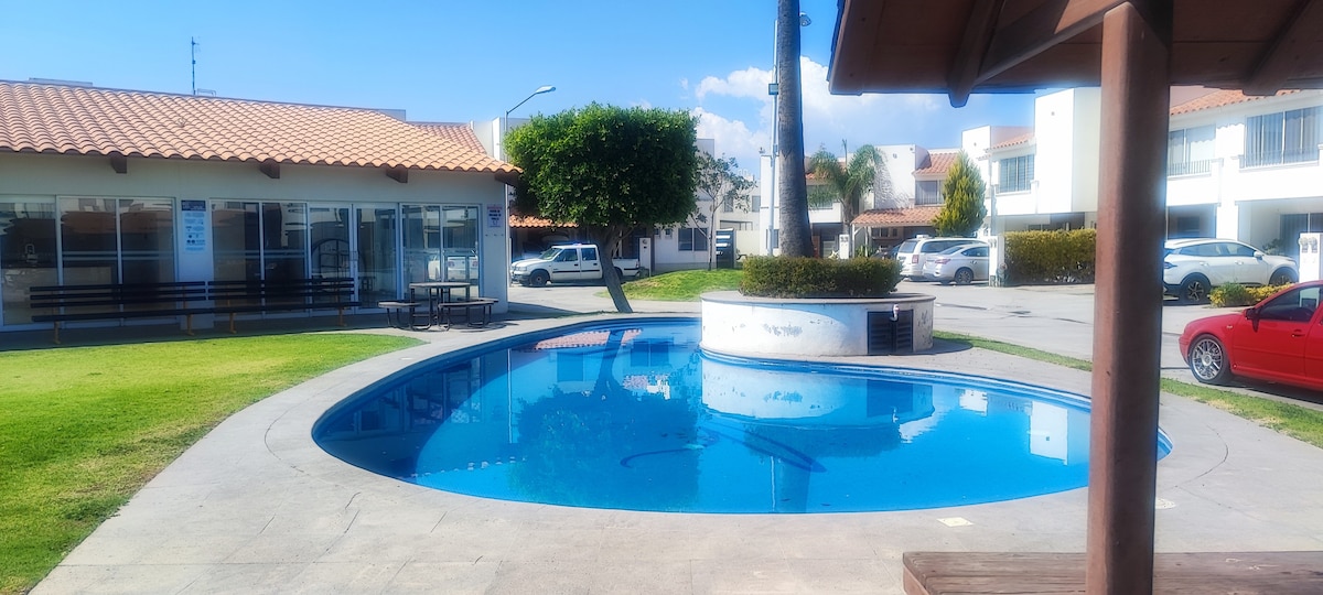 - Ideal for work stays in Zona Industrial SLP. - Billing available -Fast WiFi and own parking - Small, gated subdivision with 24/7 surveillance - 3 min to Highway 57, 10 min to GM and Plaza Comercial, 15 min to BMW and downtown; restaurants, mini-supermarket and Oxxo nearby - Facing a green area, new equipment: smart TV, equipped kitchen - Comfortable and practical, perfect for executives, technicians or tourists looking for tranquility and convenience