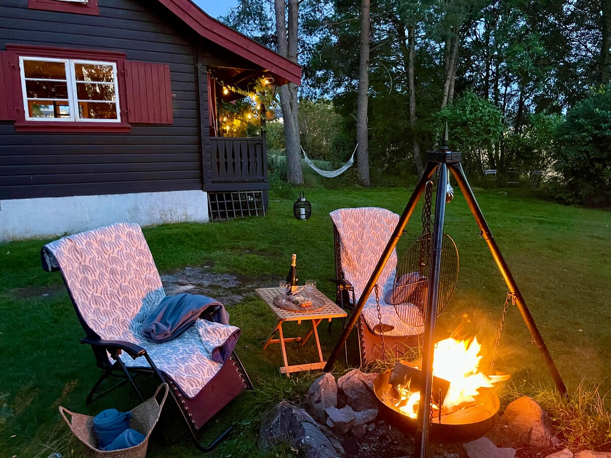 Welcome to rural idyll and charm, a cozy renovated cottage from 1945. Perfect stop for those passing through and for those who want to enjoy this cozy place. Here it is quiet and peaceful and you can relax in the hammock, fire up the fire pan, or just relax in the cabin. The cabin has electricity and water and there is a biological toilet in the annex, and an exclusive outdoor shower with both hot and cold water. Tusenfryd 5 min away Beach, 5 min Oslo city limits, 15 min (By car)