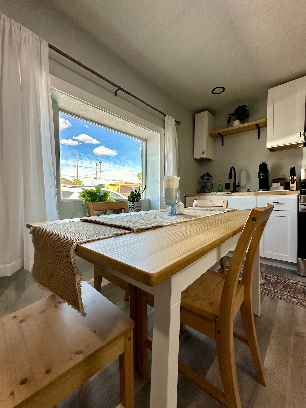 800ish square foot not so tiny casita designed for those who enjoy a quiet evening inside or outside. Curated to peaceful perfection. The inside and outside of this cozy and minimalistic space, will make any time the perfect moment to wind down. Lots of natural sunlight for a well lit inside space at all times of the day; a pergola and comfortable patio set in a fenced backyard will make this space, your dream home away from home!