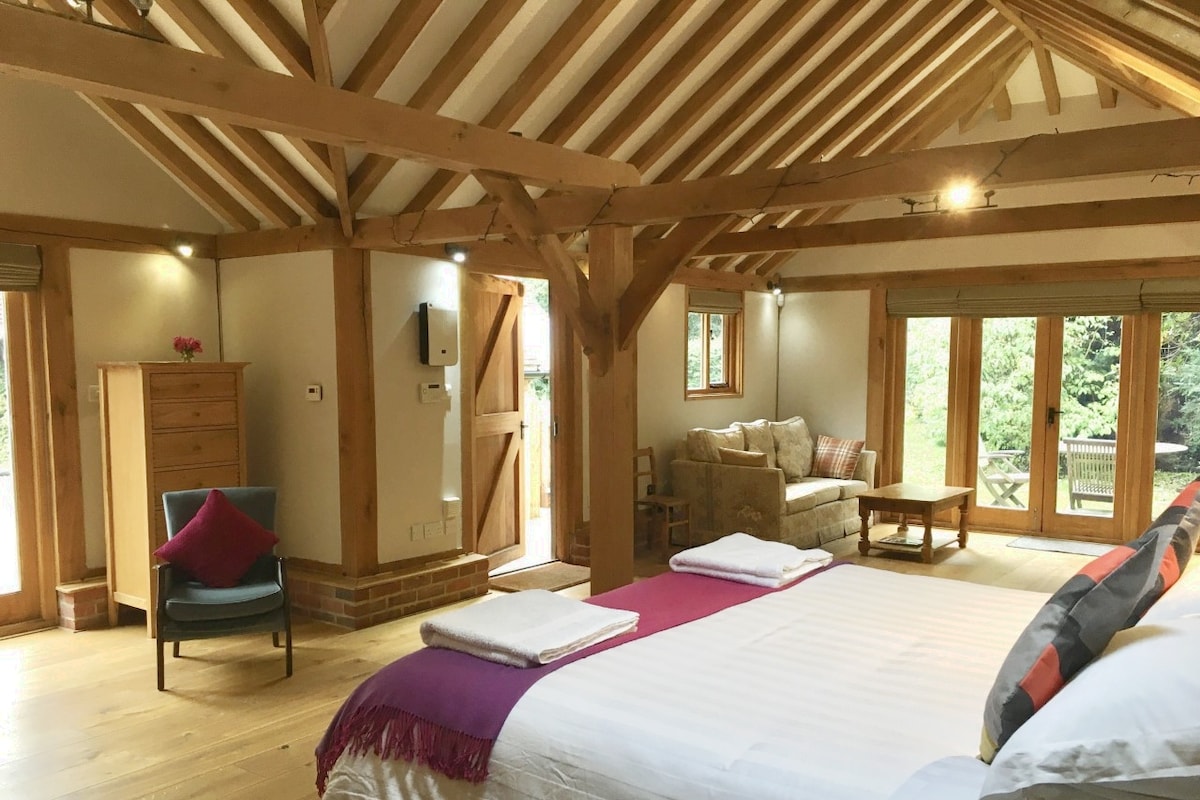 Our chalet-inspired studio barn, with vaulted ceilings and oak beams, is light and airy in the summer and beautifully warm and cosy in the winter, with underfloor heating throughout. It is completely self-contained, with a separate entrance from the adjacent family house. With a sumptuous superking bed (or two twins), sofa bed, unlimited fast WiFi and HDTV, you are assured of a relaxing and welcoming stay in a family-friendly setting in the East Sussex countryside.