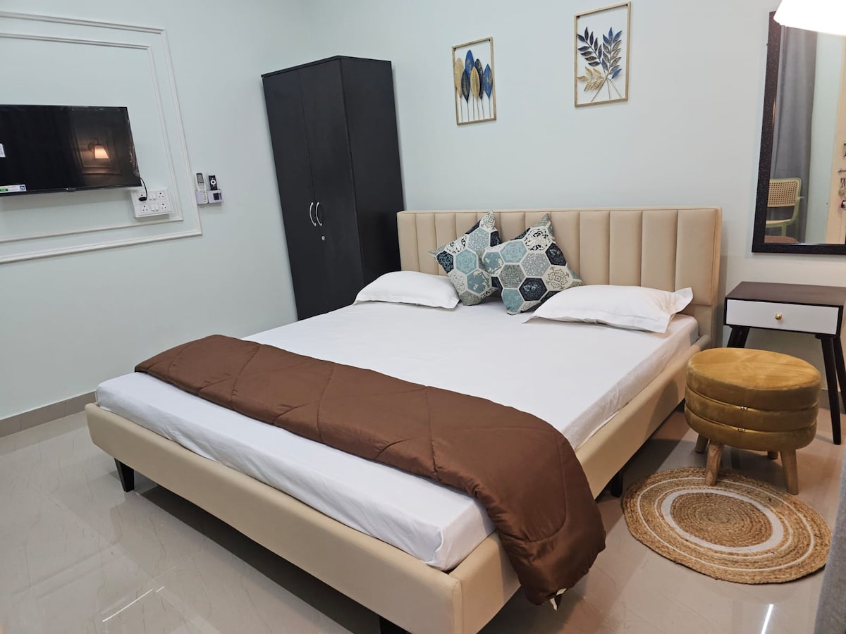 A peaceful, cozy & stylish homestay with a spacious bedroom, a hall cum kitchen, & an attached bathroom for family, couple or a group of 4-5 people. The stay comes with all the modern amenities like TV, WiFi, Geyser for a perfect homely stay; be it a private short or a longer holiday stay. The kitchen is well equipped to cook meals (15 min doorway online food delivery is also available). Located near the highway makes it an easy hassle-free entry and exit avoiding the city's tiresome traffic..