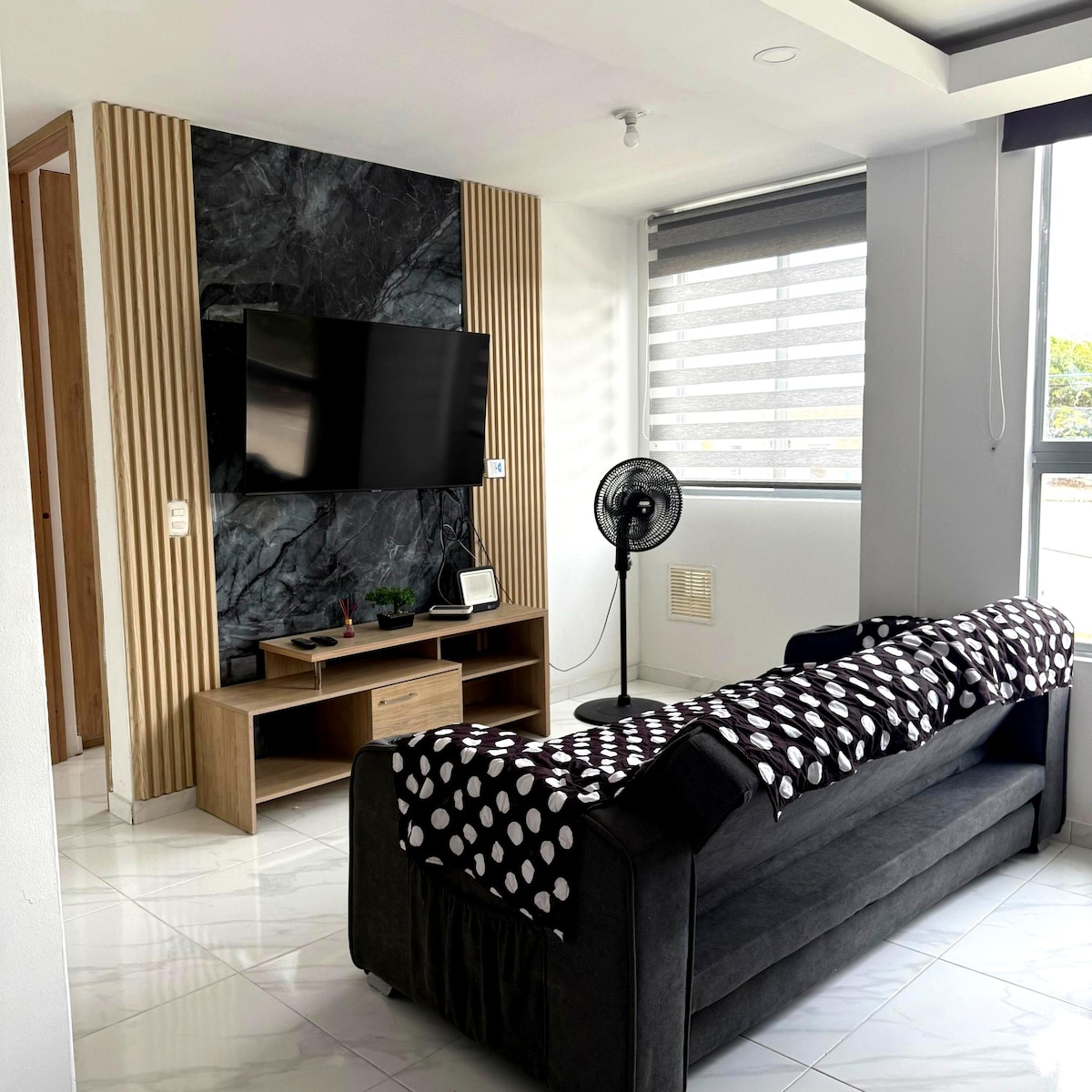 Comfortable and beautiful apartment with 2 bedrooms, each with a closet, private bathroom and AC. Main bedroom with double sofa bed (another double bed underneath) and the secondary bedroom with 2 single sofa beds (another 2 single beds underneath). Fully equipped kitchen. Living room and study with AC. High-speed Wi-Fi and cable signal. 3 Smart TVs. Building with a swimming pool and gym. Safe area. Please note that you must send your documentation prior to check-in (Colombian laws).
