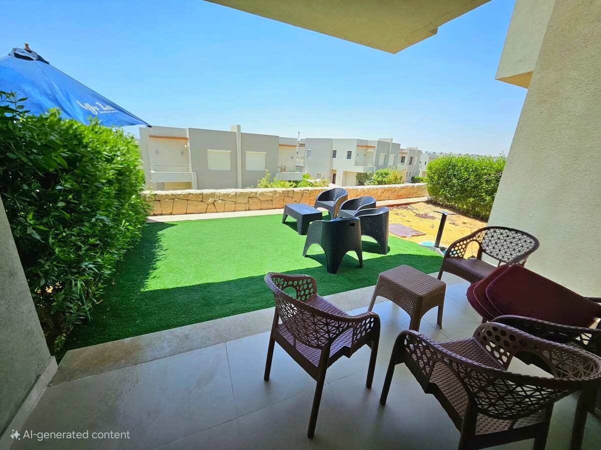 Relax with the whole family at this peaceful place to stay. It is 3 bedrooms first floor chalet. The chalet is fully air conditioned with amenities including a fully equiped open kitchen, smart TV, living area, balkony and a roof with dining area and BBQ, on spacious golf garden. The flat is walkable to adult pool and shaded kids pool. 4 minutes by car to Jazz hotel and large sandy beach.