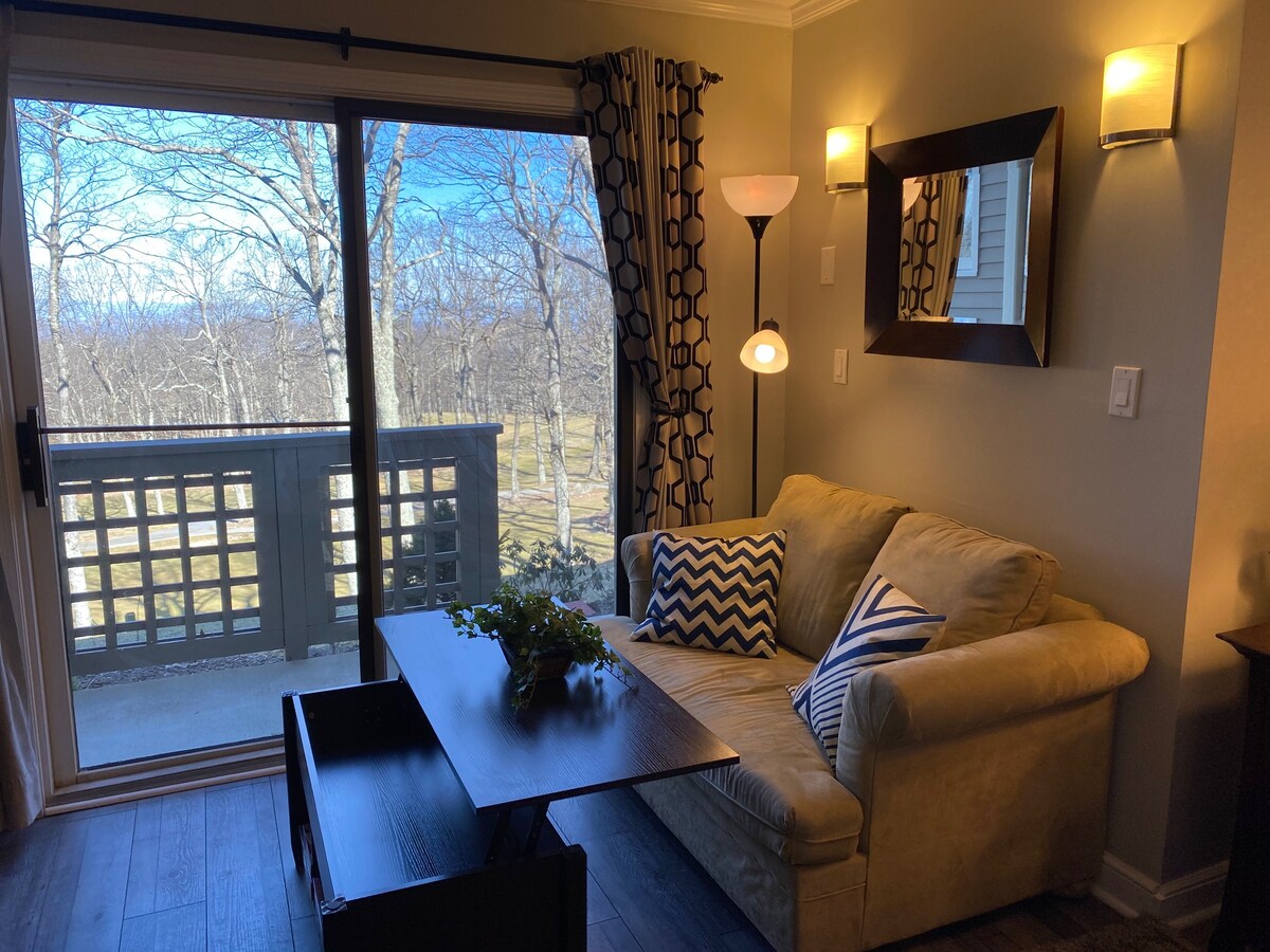 Cozy 1BR Wintergreen condo ⛷️❄️ 5-minute walk to the ski slopes, resort village, and mountain-too market, with snow tubing only minutes away. Enjoy a fully stocked kitchen, premium coffee and teas, cooking oils and spices. Relax by the wood burning fire and enjoy a smart TV, fast WiFi and games. Comfortable queen bed in the bedroom plus new queen sleeper sofa in the living room. Private furnished patio with peaceful wooded views and close access to the village for après-ski.