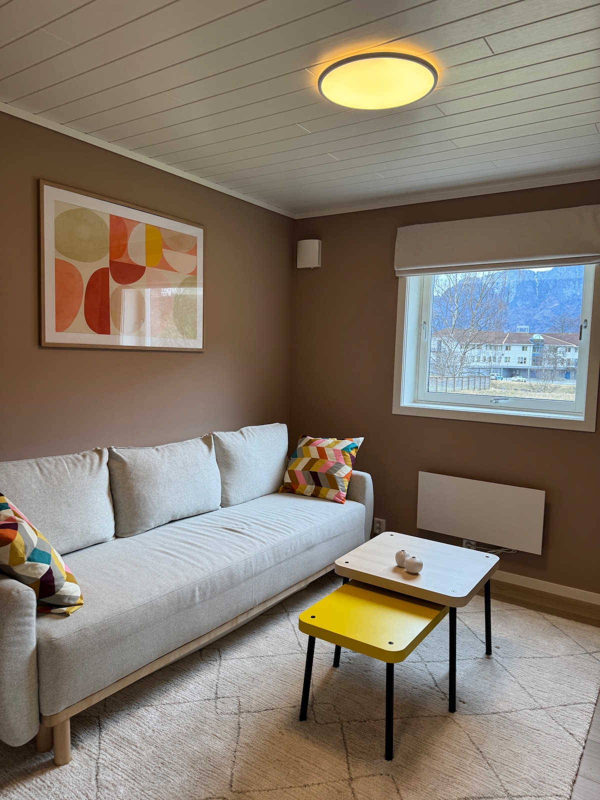 Newly renovated apartment within a short walking distance to the fjord, shop and café. The apartment has 1 bedroom, a living room with a TV, and a well-equipped kitchen and bathroom with a combined washing machine and dryer. There is an EV charging station in the car park, which can be used for an additional fee.