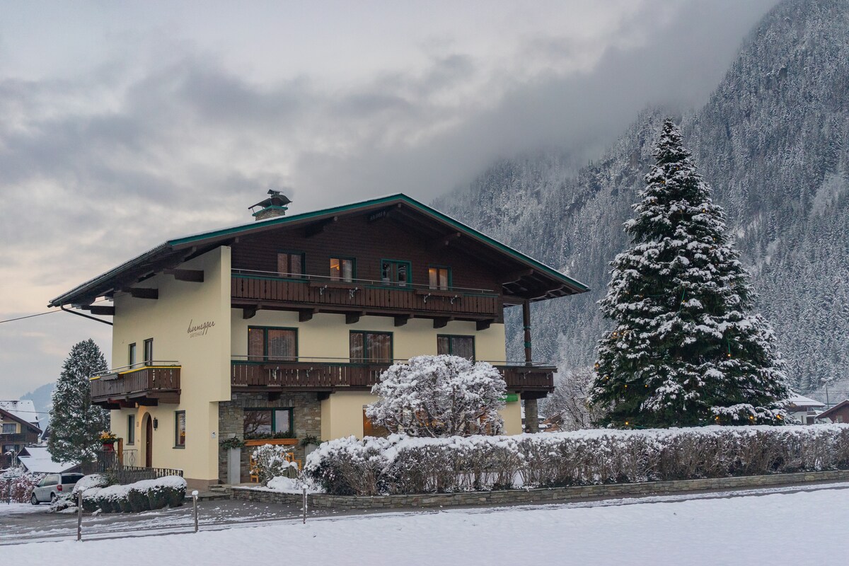 Cozy vacation home in the middle of the Saalbach-Hinterglemm and Zell am See ski resort. The guest house sleeps 11 people in 2 apartments. Each apartment offers a kitchen, shower and toilet. A storage room in the basement offers space for skis or bicycles, and there is also sufficient parking space. The guest house was newly renovated in 2025 and comfortably furnished.